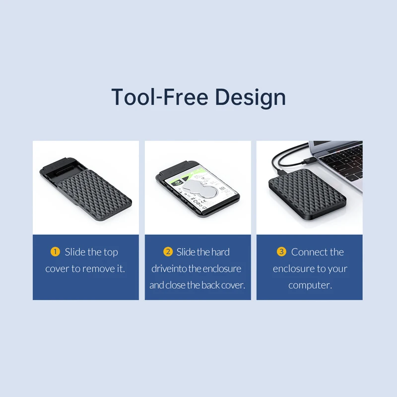 * Súper fácil de usar: instalación sin herramientas.Simplemente deslice la cubierta, inserte su unidad de 2,5" asegurándose de que esté bien conectada y luego reemplácela deslizando la cubierta nuevamente.