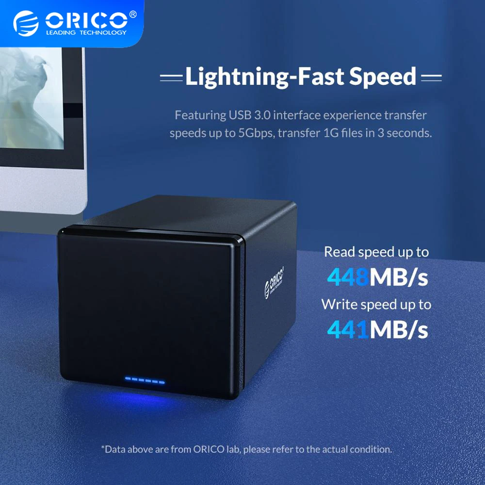 Código de producto ORICO NS500C3 Material Aleación de aluminio + ABS Capacidad compatible 80TB,16TB Dimensión de disco único 136x224x160mm Interfaz de salida USB3.1 Tipo-C Velocidad 5Gbps UASP (Velocidad teórica) fuente de alimentación 12V6.5A Indicador LED azul Herramienta de instalación Sistema compatible gratuito Windows/Mac / Linux