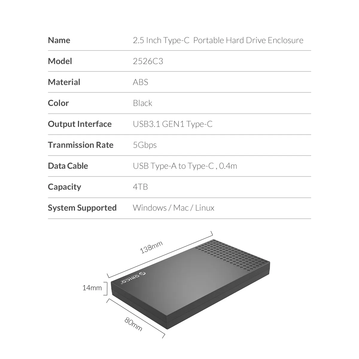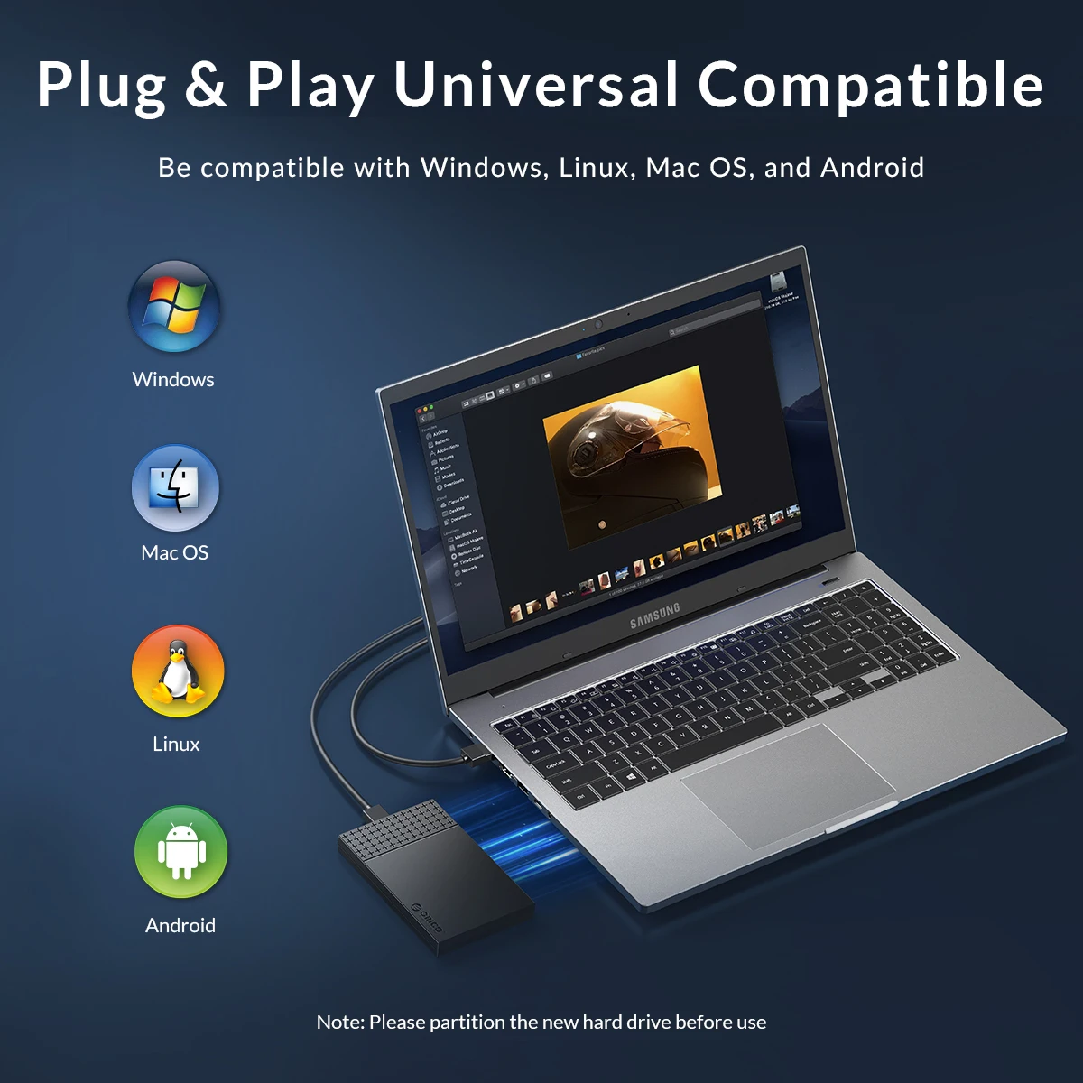 La carcasa de disco duro ORICO es compatible con sistemas Windows/mac/Linux.Diseñado para discos duros de 7 mm/9,5 mm y 2,5 pulgadas y soporte máximo de 4 TB.Se adapta a discos duros SATA como WD, Seagate, Toshiba, Hitachi, Samsung, Crucial, SanDisk, etc.Y se puede utilizar para computadoras, televisores, enrutadores inteligentes, PS4, XBOX y otros dispositivos.