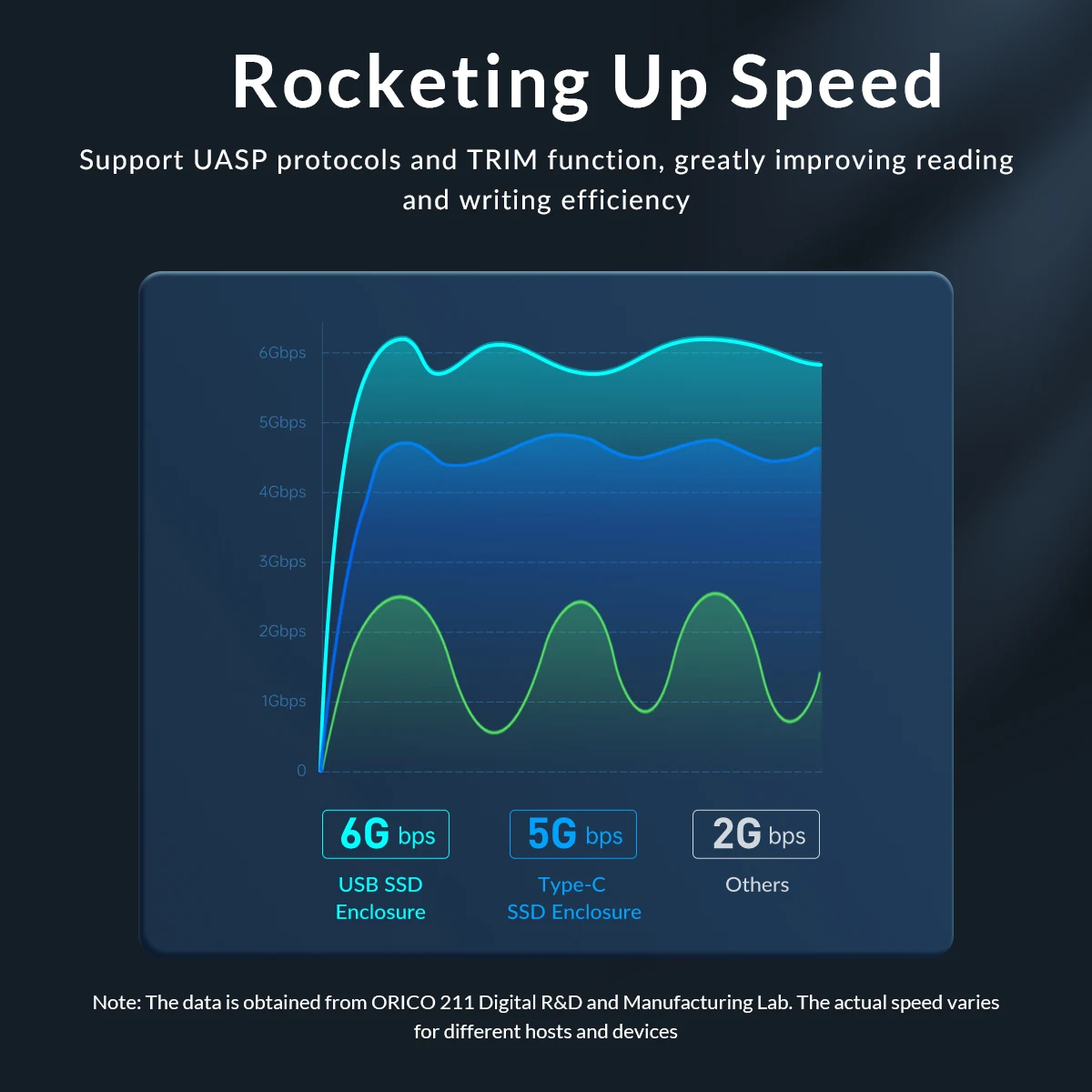 Súper velocidad UASP de 5 Gbps: el puerto USB C 3.1 Gen1 de esta carcasa de disco duro admite velocidad máxima de transferencia de 5 Gbps/6 Gbps (nueva actualización) y protocolo de transmisión acelerada UASP.Cuando se conecta a una computadora que también admite UASP, su velocidad es un 20% más rápida que el USB 2.0 tradicional.Compatible con versiones anteriores de puertos USB 2.0 o 1.1. La velocidad más rápida probada por el laboratorio ORICO hasta 400 MB/s.