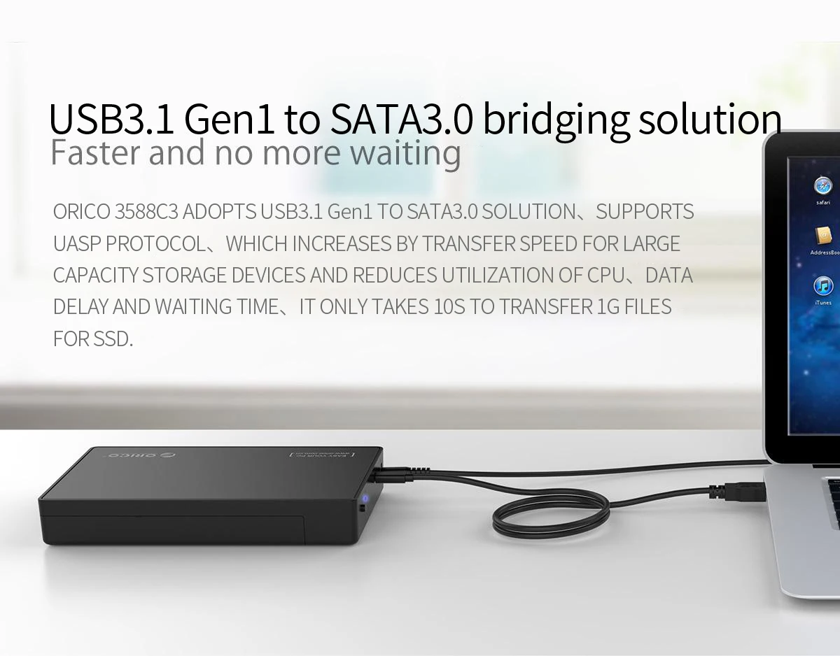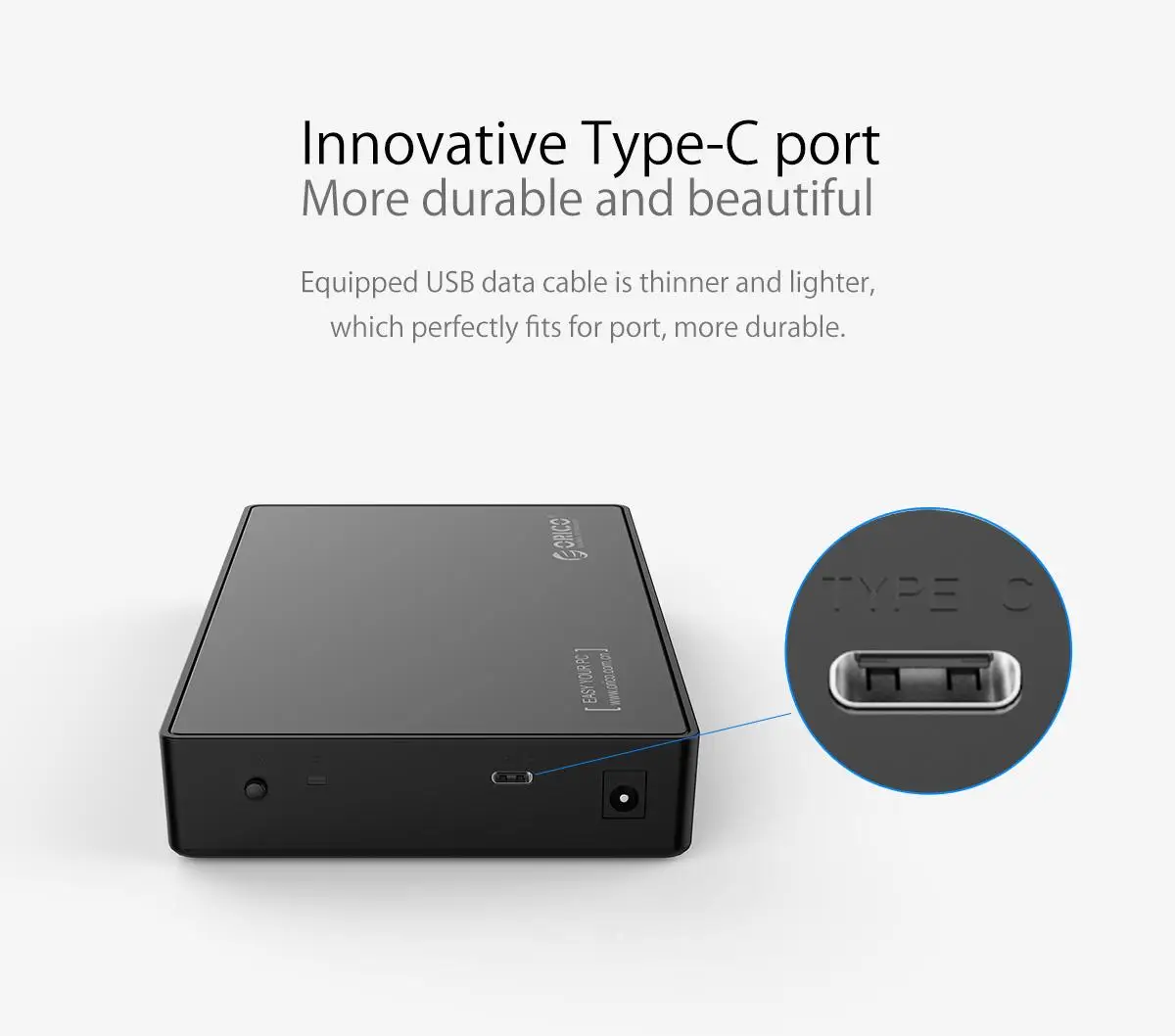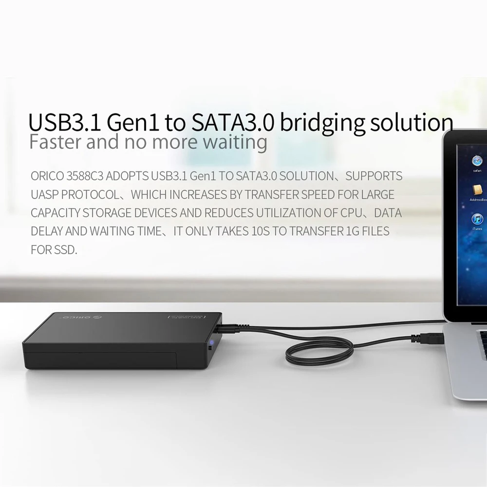 Producto CodeORICO 3588C3 Compatible HDD Type2.5/3,5 pulgadas HDD InterfaceType-C + SATA Soporte Capacity8TB Dimension194 x 118x31mm InstallationTool Free Power Supply12V2A Adaptador de corriente Sistemas compatibles Windows 10 / 8 / 7 / Vista / XP, mac OS v9.0 o superior Cable de datosTipo-C a