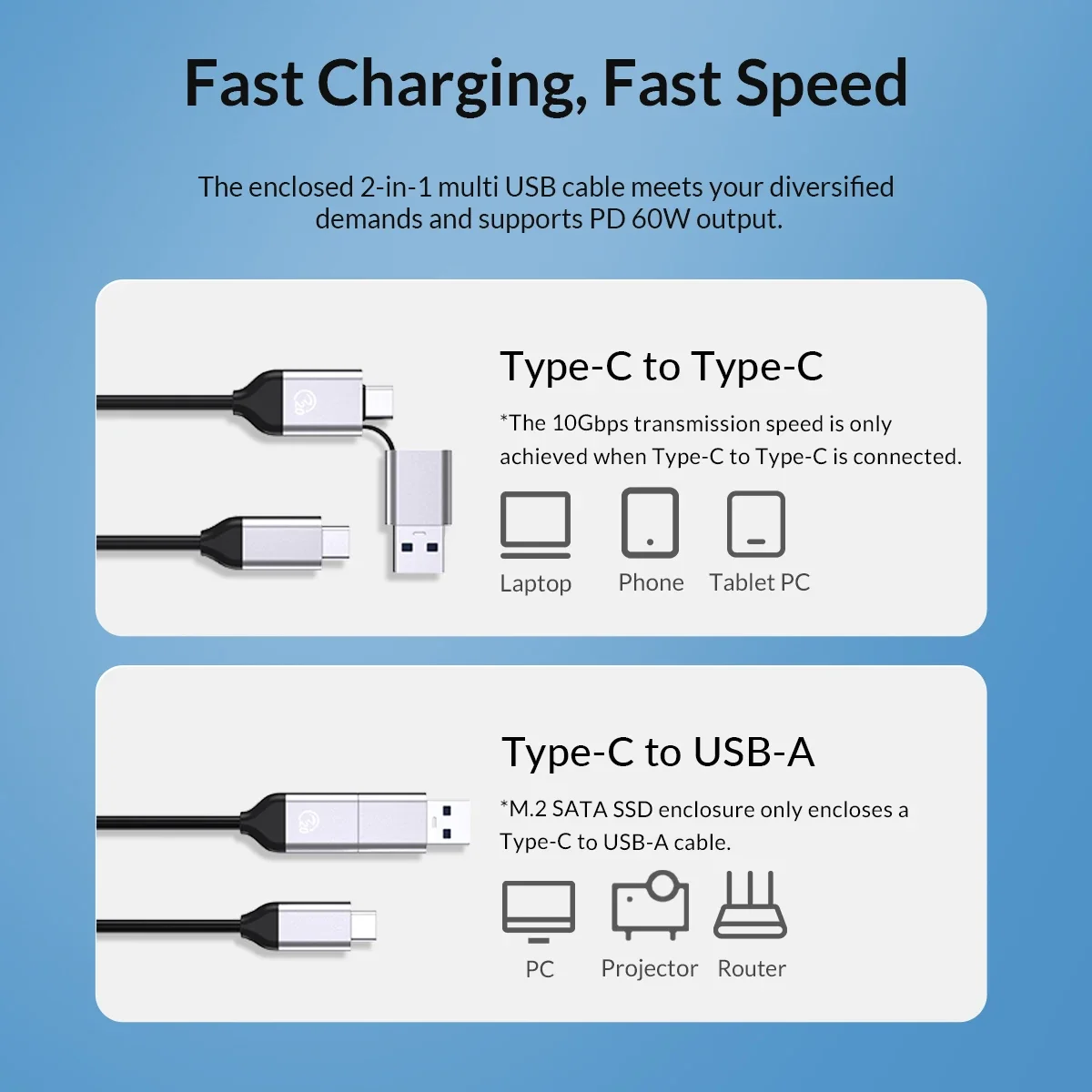 El cable multi USB 2 en 1 cerrado satisface sus demandas diversificadas y admite salida PD 60W