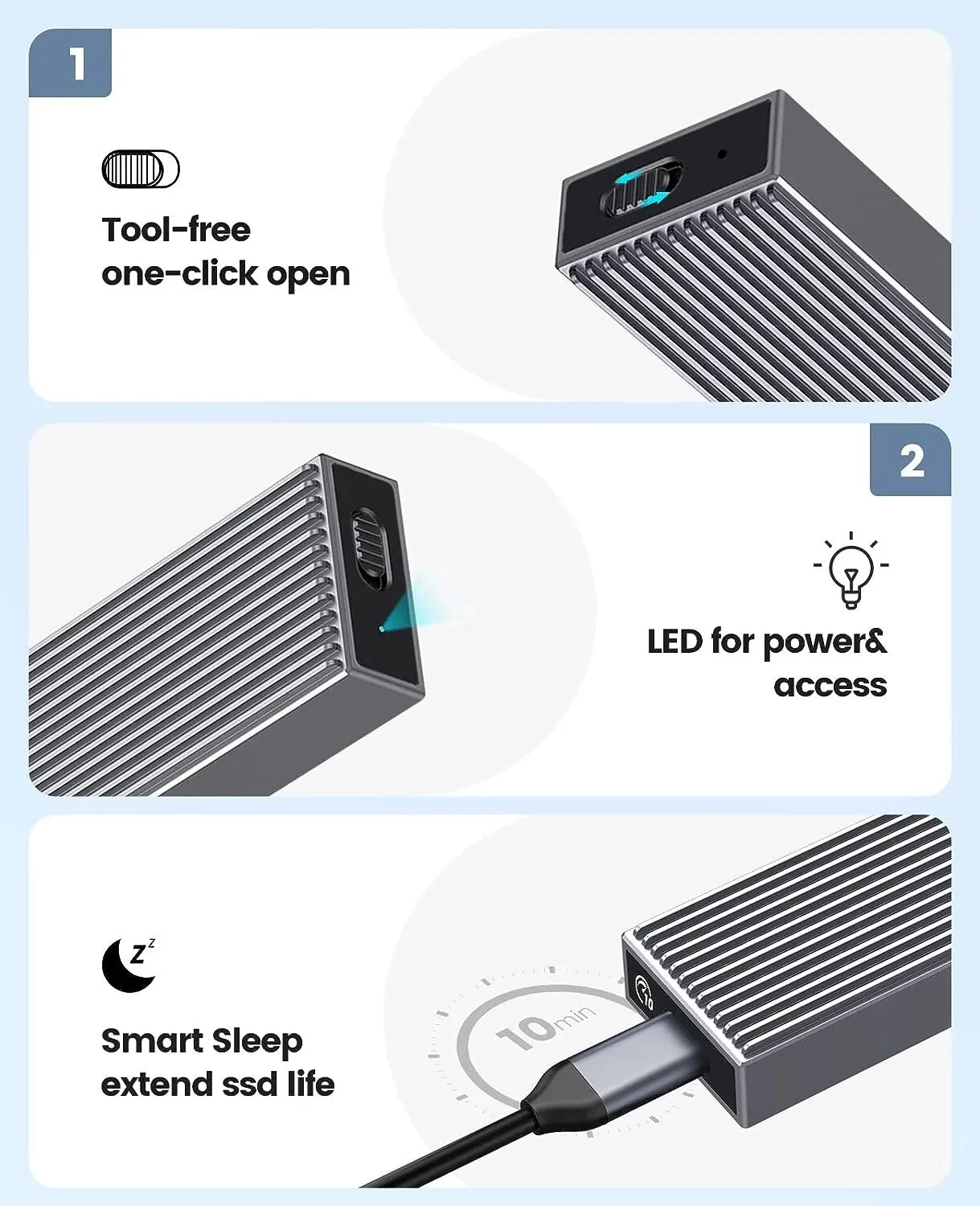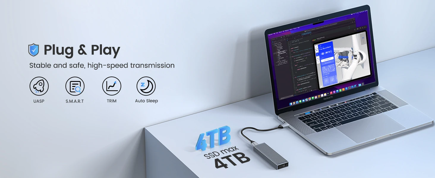 Caja ORICO NVMe SSD con controlador IC de alto rendimiento, admite protocolo de aceleración UASP y funciones Trim, SMART, que pueden mejorar eficazmente la velocidad del SSD, proteger el funcionamiento de los datos y extender la vida útil del SSD.