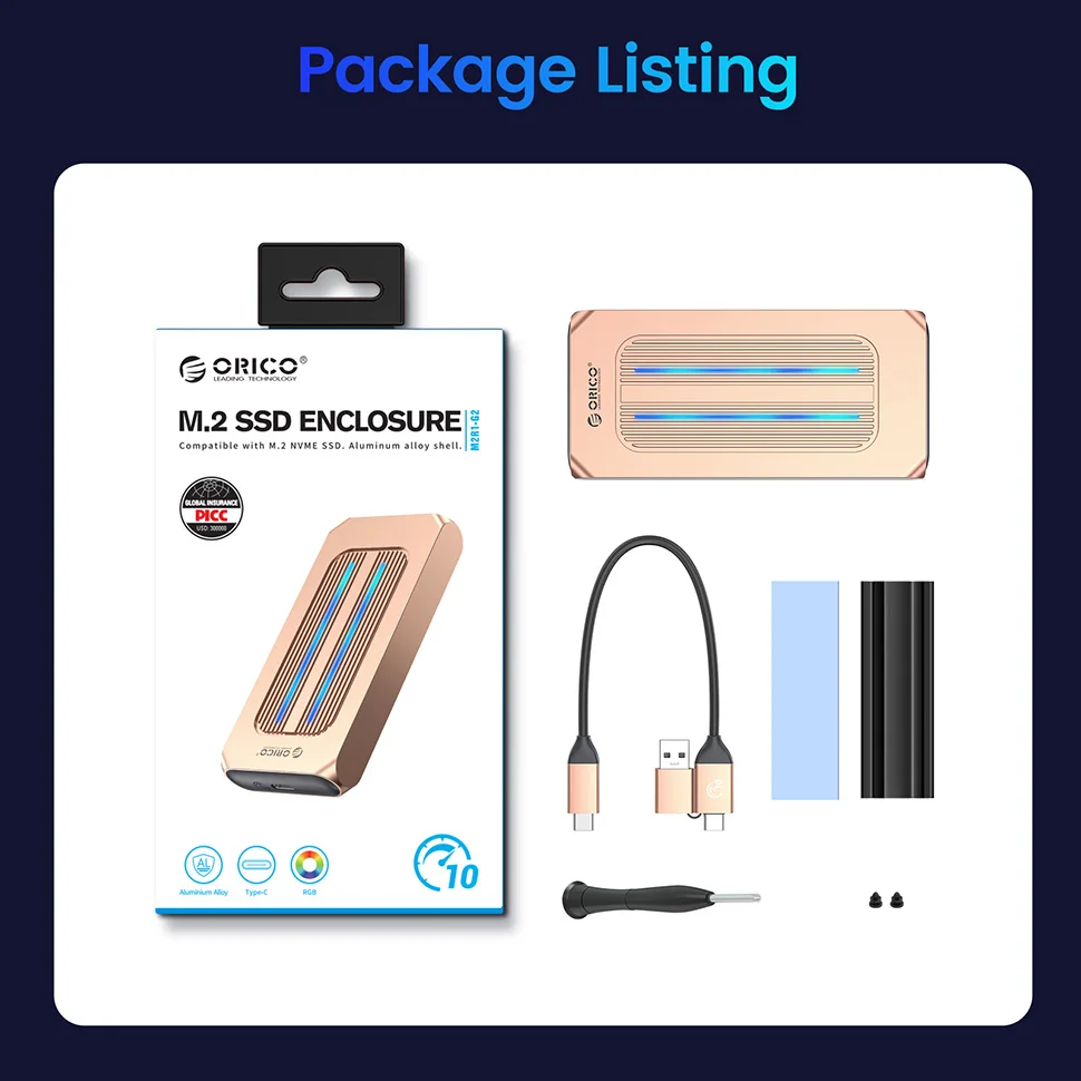 La carcasa ORICO 10Gbps M.2 SSD es compatible con M Key o M & B Key's 2230 2242 2260 2280 M.2 PCIe NVMe SSD. La carcasa SSD es compatible con Windows, Mac OS y Linux. Plug and play, no se requieren controladores ni software adicionales.
