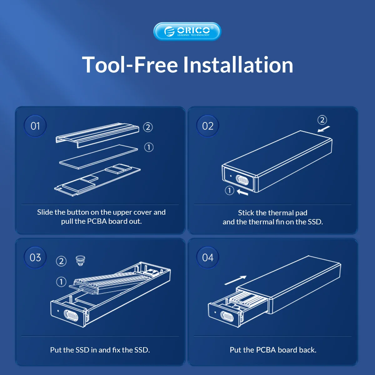 La carcasa ORICO 10gbps M.2 SSD es compatible con M Key o M & B Key's 2230 2242 2260 2280 M.2 PCIe NVMe SSD. La carcasa SSD admite Windows, Mac OS y Linux. Plug and play, no se requieren controladores ni software adicionales.