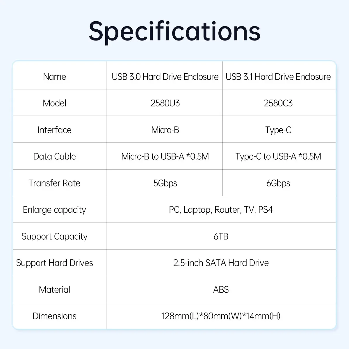 【Carcasa de disco duro portátil de 2,5 pulgadas 】-La carcasa de disco duro externo ORICO puede conectar fácilmente su antiguo disco duro SATA I/II/III de 2,5 pulgadas para transferir archivos de una PC a otra PC, portátil, PS4 o conectar como un puerto USB. Se incluye un cable de 50cm para una conexión flexible y portabilidad.