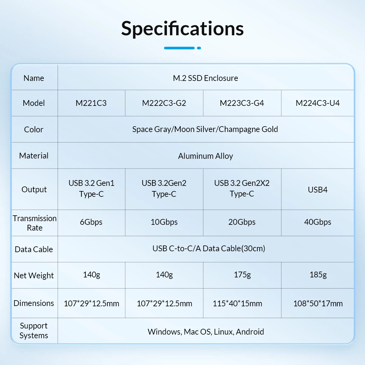 Solo es compatible con el protocolo NVME PCI-E M Key/M & B Key SSD, con cable de fecha de 30cm C a C/A 2 en 1.