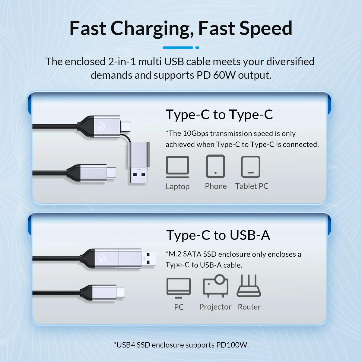 【Cable 2 en 1 actualizado】 El cable USB incluido con el adaptador USB M.2 tiene 2 puertos de salida, USB C a A (10Gbps) y USB C a C (20Gbps), que se puede conectar libremente a ordenadores, teléfonos móviles, consolas de juegos y otros equipos. El cable tiene 30cm de largo, que es más flexible y estable de usar y tiene una vida útil más larga.