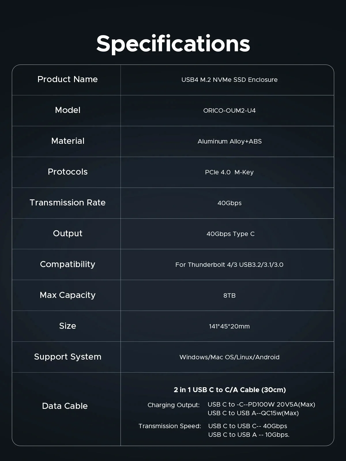 Con interfaz de salida USB4 tipo C, admite la velocidad máxima de transmisión de hasta 40Gbps. La velocidad máxima de lectura continua medida puede alcanzar los 3700 MB/s, y la escritura continua puede alcanzar los 3100 MB/s.(NOTA: la velocidad se verá afectada por SSD y el rendimiento del ordenador)