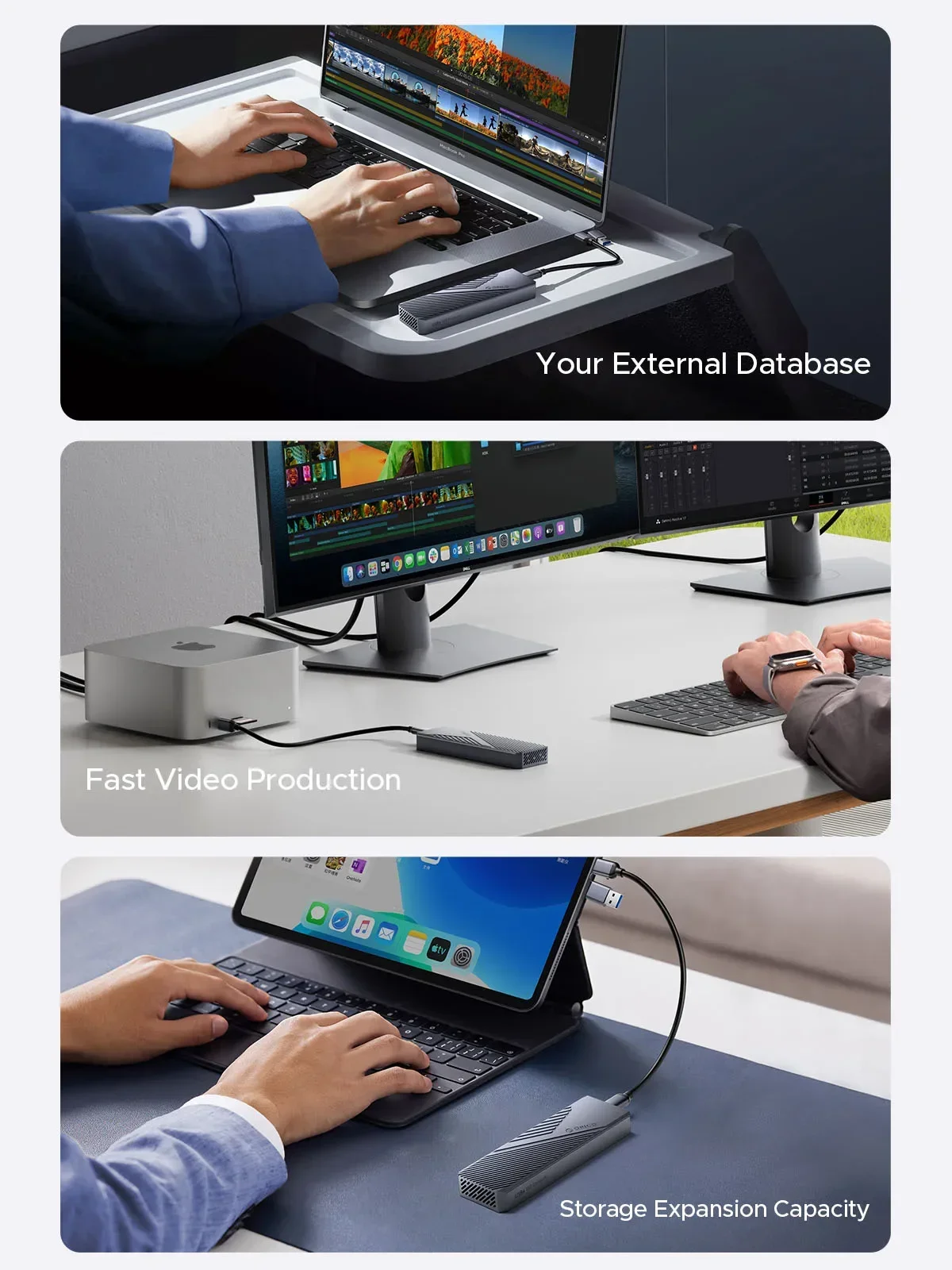 Si usted es un diseñador, viajero de negocios, fotógrafo, creador de contenido o videógrafo, los recintos ORICO USB4 le permiten manejar con confianza grandes cantidades de videos, imágenes, archivos, y datos digitales de forma rápida y sencilla. Amplíe su almacenamiento digital, haciendo que su trabajo y su vida sean más fáciles y eficientes.