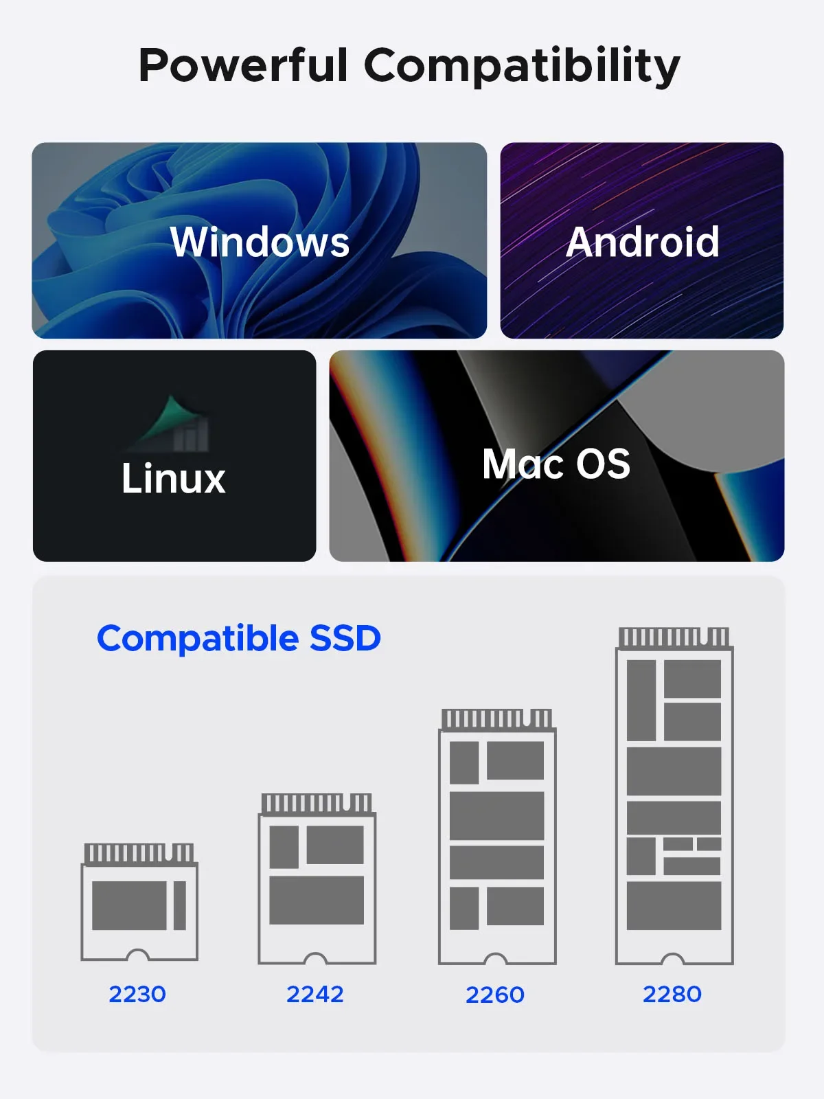 Compatible con NVMe SSD en tamaños 2230/2242/2260/2280. Como M.2 NVMe M Key SSD. incluido el último PCIe Gen 4x4 SSD.
