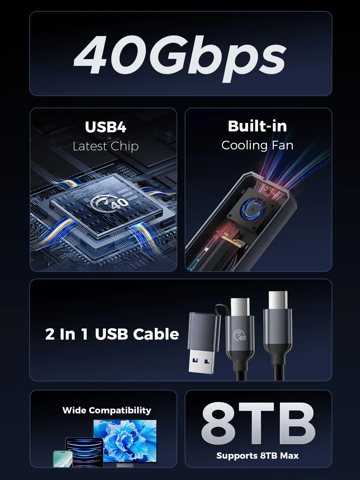 Recinto SSD USB4 verdadero con ventilador de refrigeración compatible con capacidad de 8TB