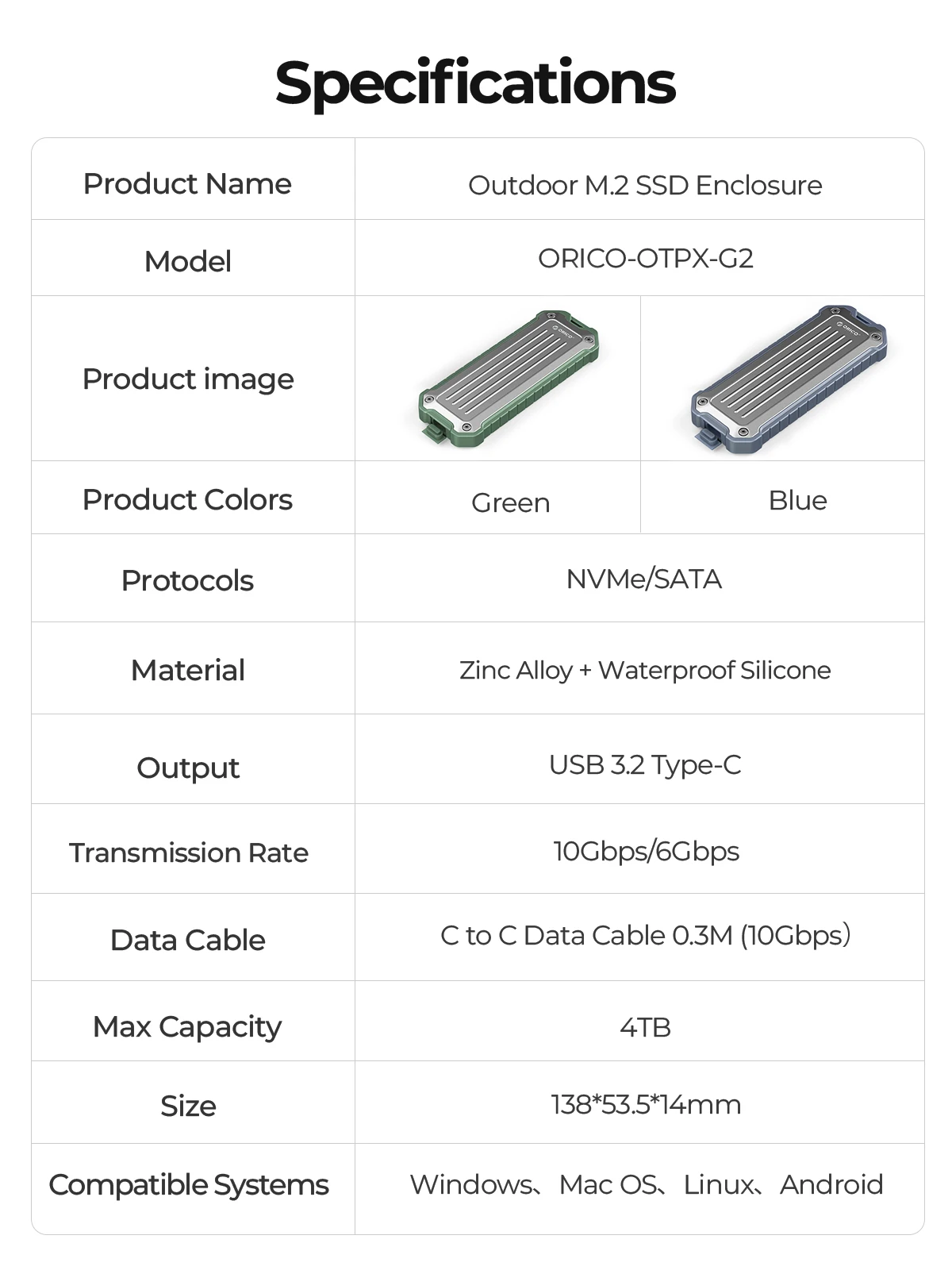 Por qué elegir ORICO Outdoor Portable M.2 NVMe/SATA Dual Protocol Enclosure