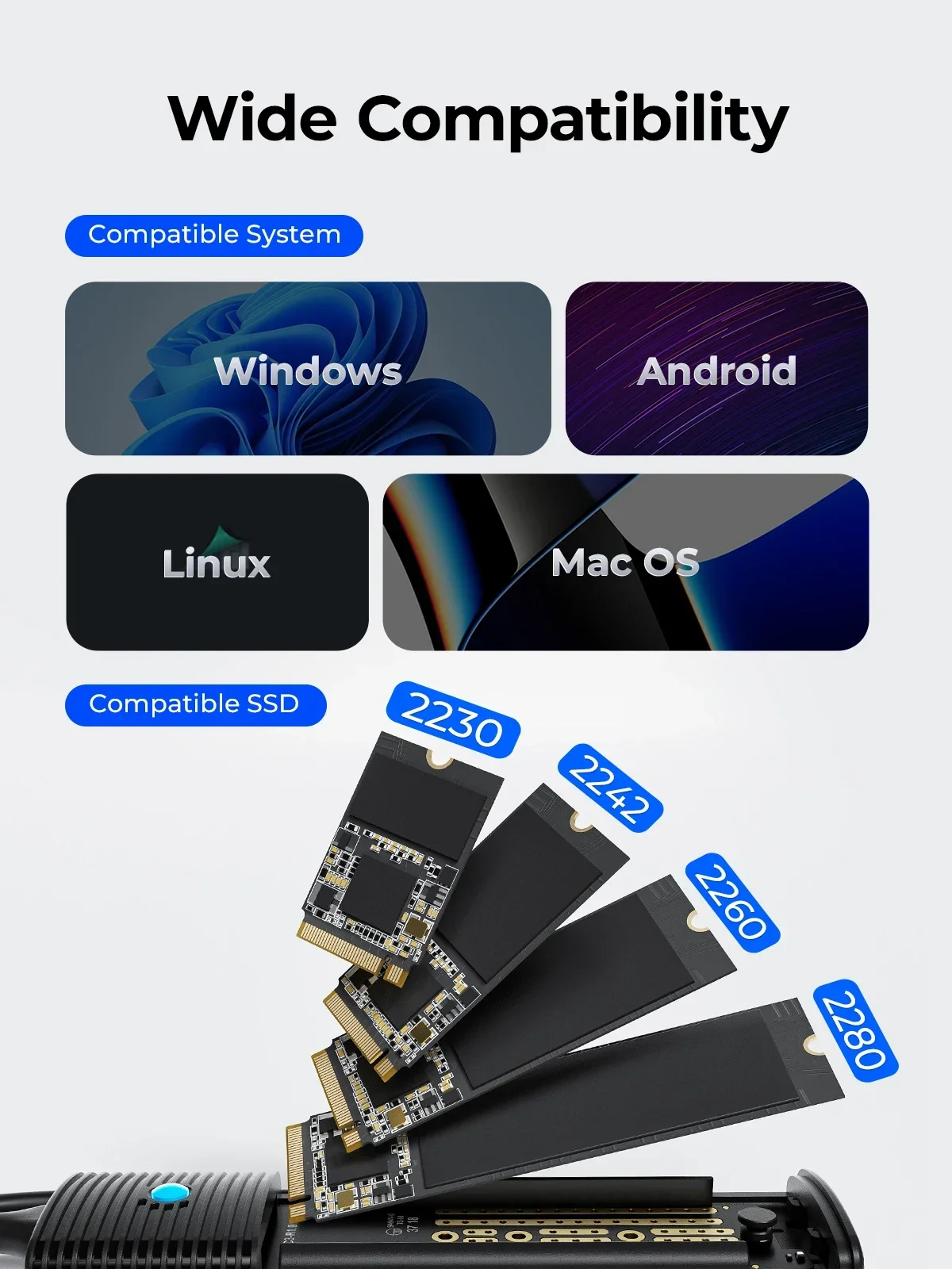 Compatible con SSD M.2 con tamaño de 2230/2242/2260/2280mm hasta4TB.
