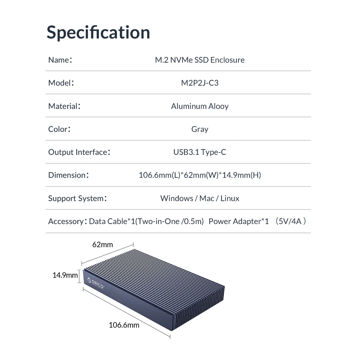 Comprar ORICO-carcasa SSD de aluminio de doble bahía, NVME M.2, USB C 3,1 Gen2 10gbps para clave M y M/B, NVME PCIe SSD con adaptador de corriente 5V4A