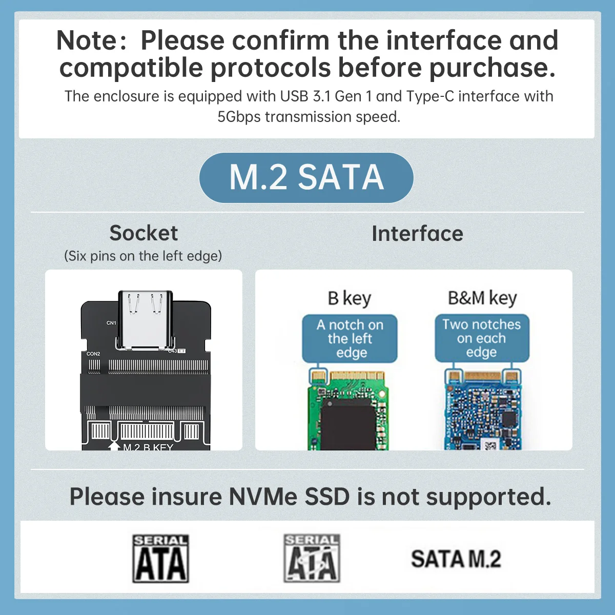 Solo admite protocolo SATA B Key/B & M key SSD, USB3.0 C con cable tipo A, fundaLa cubierta está hecha de aluminio y el cuerpo de la caja está hecho de plástico.
