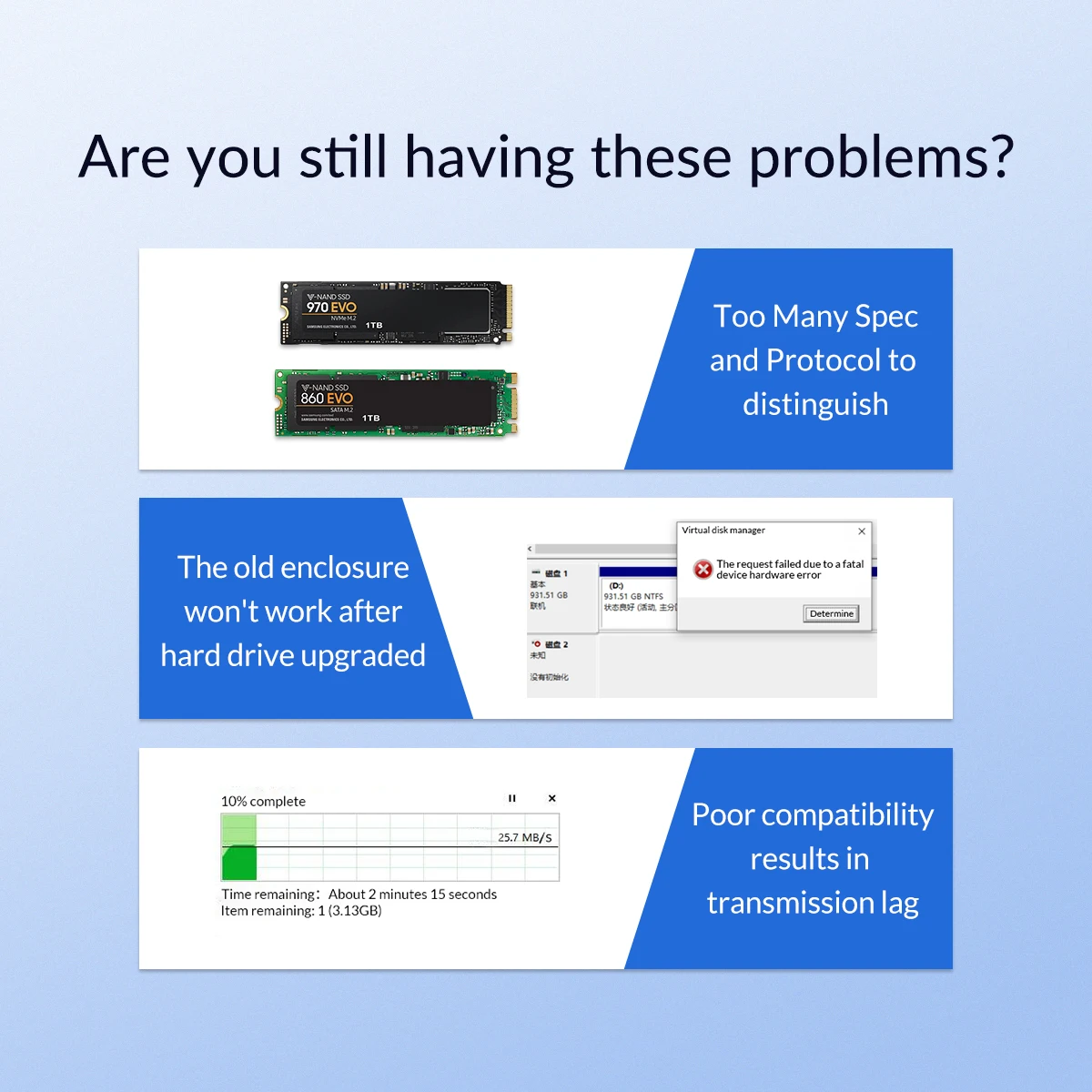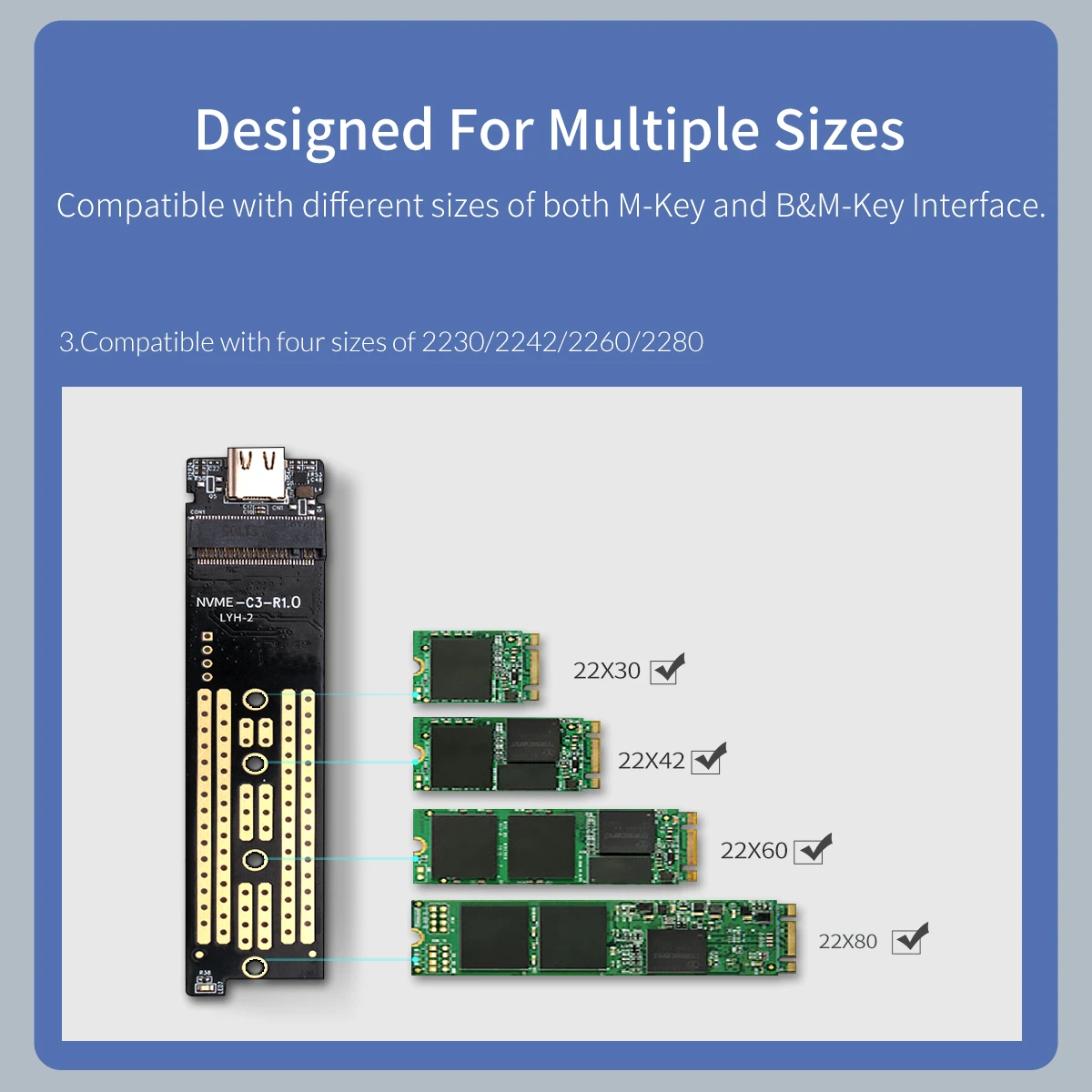 Solo admite NVME PCI-E protocolo M Key/B & M Key SSD, con cable tipo-c a tipo-c de 15cm y cable tipo-c a usb3.0.