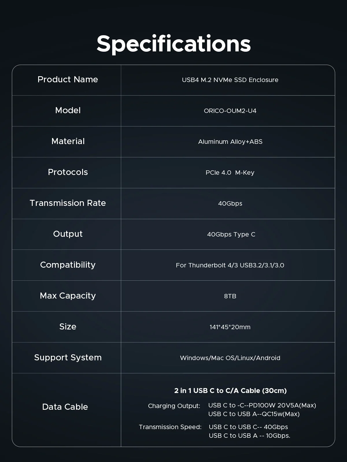 Comprar ORICO-carcasa SSD M.2 NVMe de 40Gbps, USB 4, 8TB, con ventilador de refrigeración, PCIe4.0, carcasa de aluminio Compatible con Thunderbolt 3/4 para mac