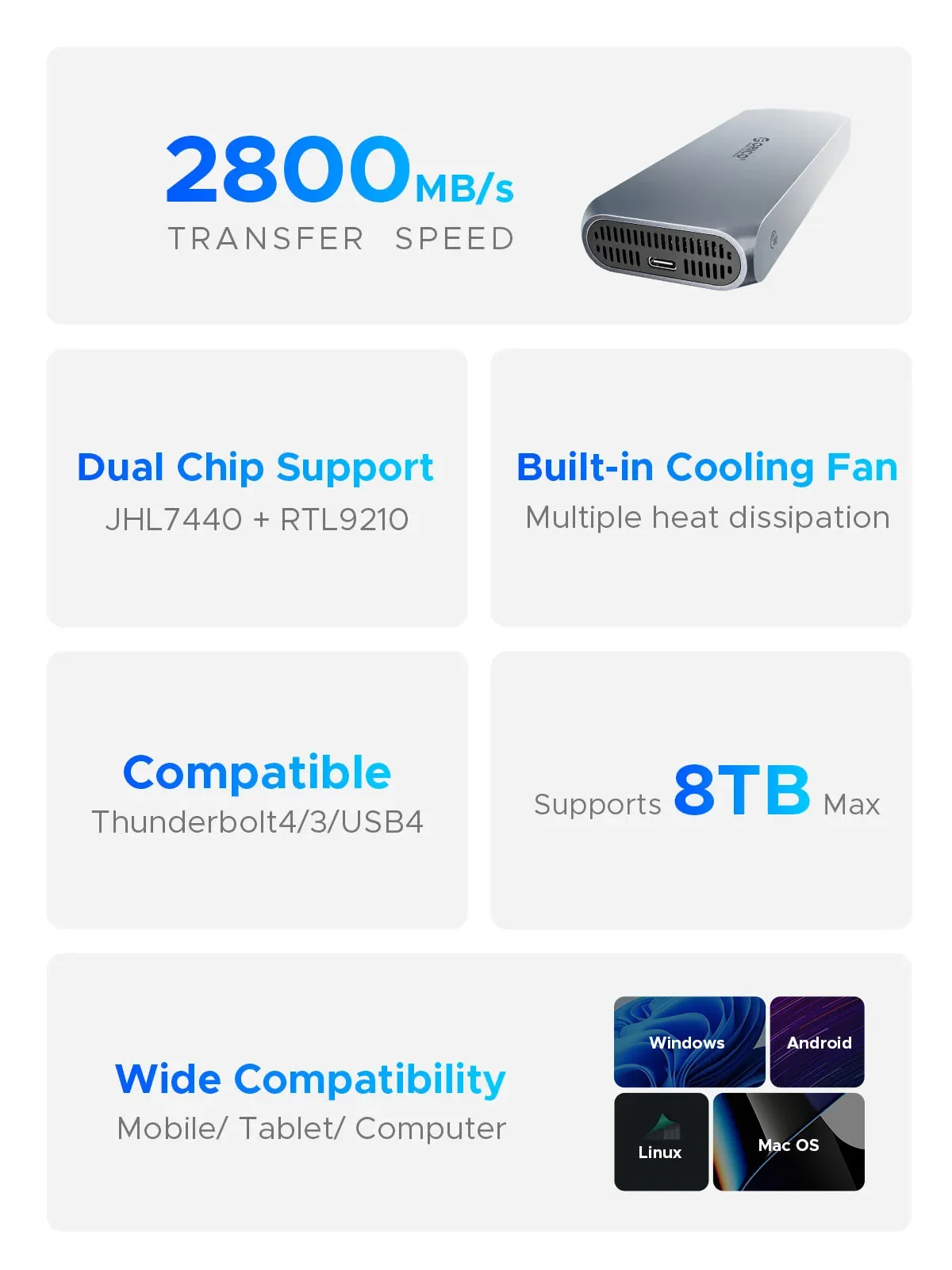 Con una interfaz de salida USB4 Tipo C, admite una velocidad máxima de transmisión de hasta 40 Gbps.La velocidad máxima de lectura continua medida puede alcanzar 2800 MB/s y la escritura continua puede alcanzar 2800 MB/s.(NOTA: La velocidad se verá afectada por el rendimiento de la pantalla y la computadora)