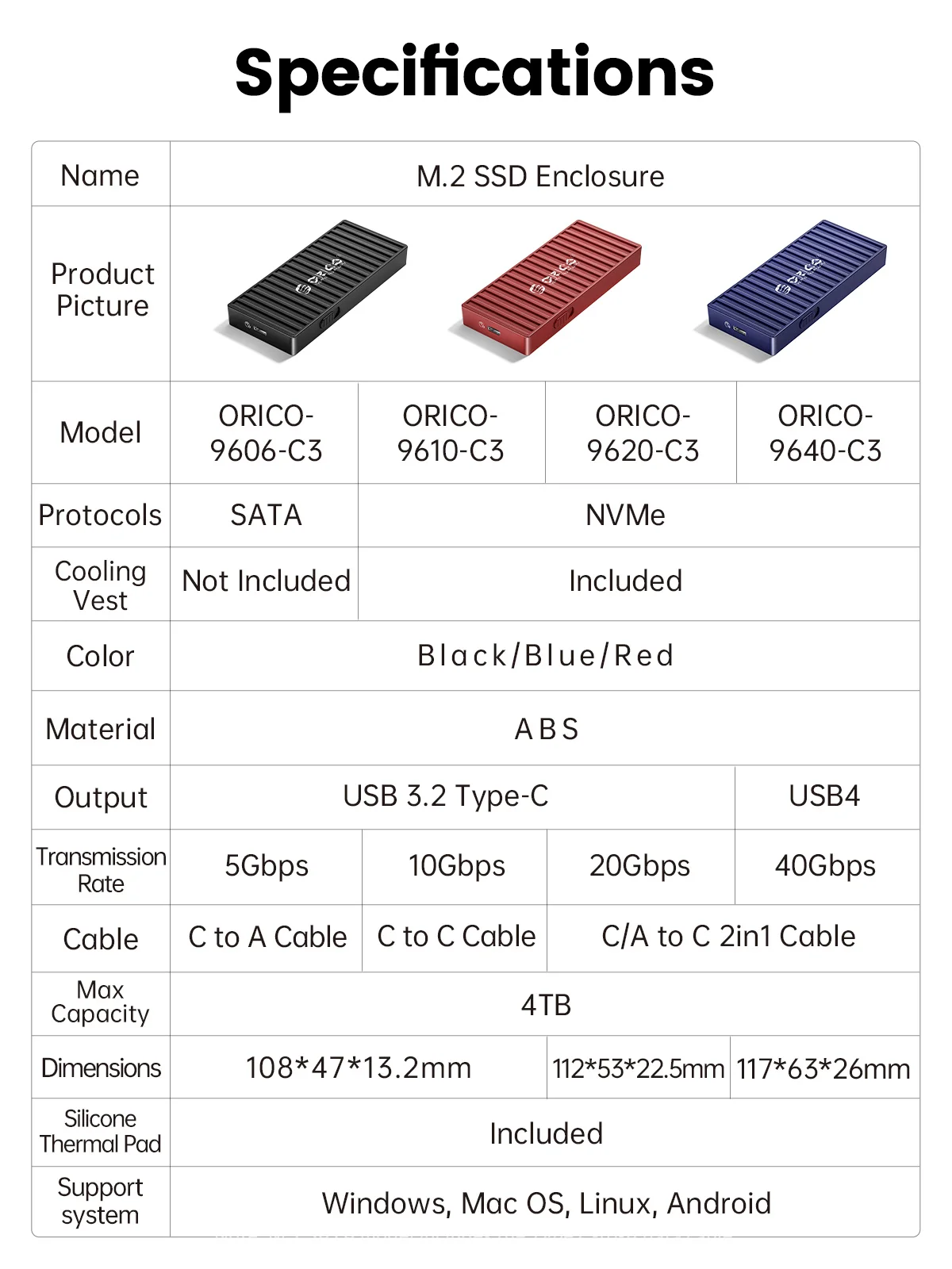 Solo es compatible con el protocolo NVME PCI-E M Key/M & B Key SSD, con cable tipo C a tipo C de 30cm.