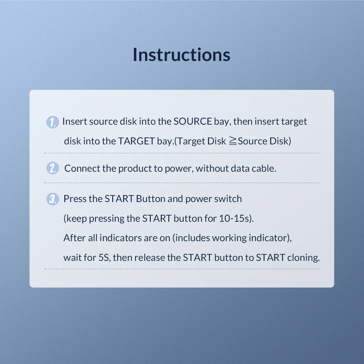 [One-Key Offline Clone] Admite clonación sin conexión, la carcasa del disco duro no se puede conectar a ningún dispositivo durante la clonación. El clon solo puede ir del disco 1 al disco 2, asegúrese de que el disco esté en la ubicación correcta y que el disco de destino tenga una capacidad mayor que el disco original. La clonación es un clon individual de todo el disco, y no identificará de forma inteligente los datos en el disco duro, ¡Haga una copia de seguridad de los datos en el disco de destino antes de la clonación para evitar perder datos importantes!
