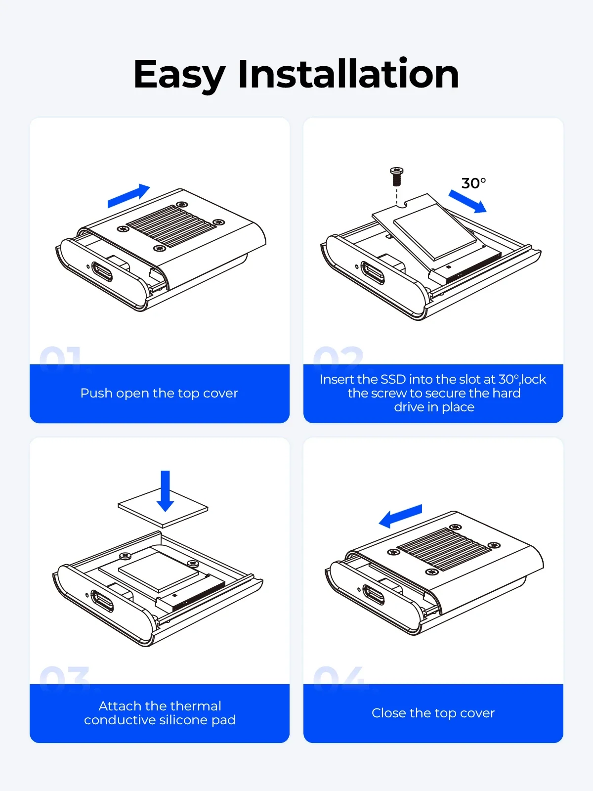 Paso 1. Empuje para abrir la cubierta superior. Paso 2. Inserte el SSD en la ranura a 30 °, bloquee el tornillo para asegurar el disco duro en su lugar. Paso 3. Coloque la almohadilla de silicona conductora térmica. Paso 4. Cierre la cubierta superior.