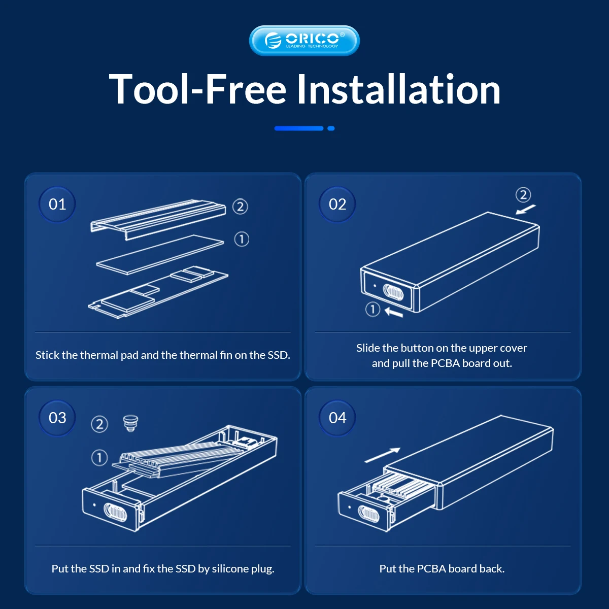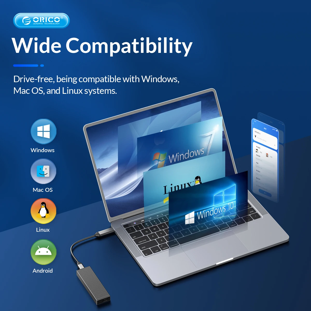 La carcasa ORICO 10Gbps M.2 SSD es compatible con M Key o M & B Key's 2230 2242 2260 2280 M.2 PCIe NVMe SSD. La carcasa SSD es compatible con Windows, Mac OS y Linux. Plug and play, no se requieren controladores ni software adicionales.