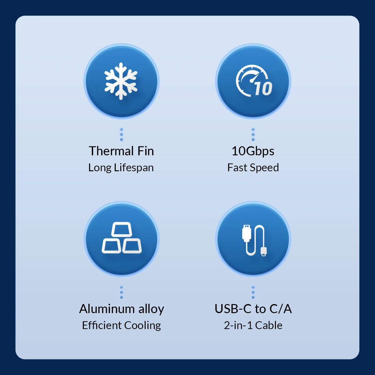 Cuerpo de aleación de aluminio con bandeja SSD deslizante, instalación sin herramientas. Haga que la instalación sea más rápida y conveniente.