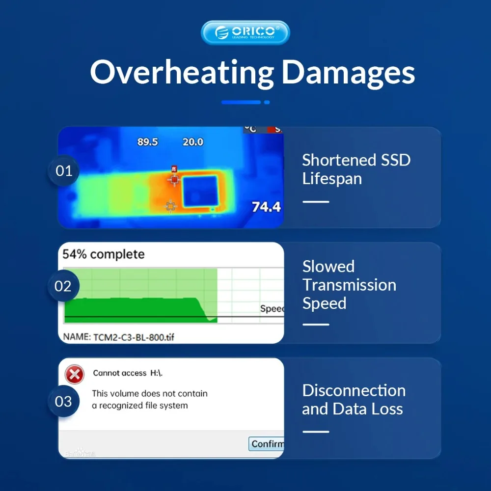 Caja ORICO NVMe SSD con controlador IC de alto rendimiento, admite protocolo de aceleración UASP y funciones Trim, SMART, que pueden mejorar eficazmente la velocidad del SSD, proteger el funcionamiento de los datos y extender la vida útil del SSD.