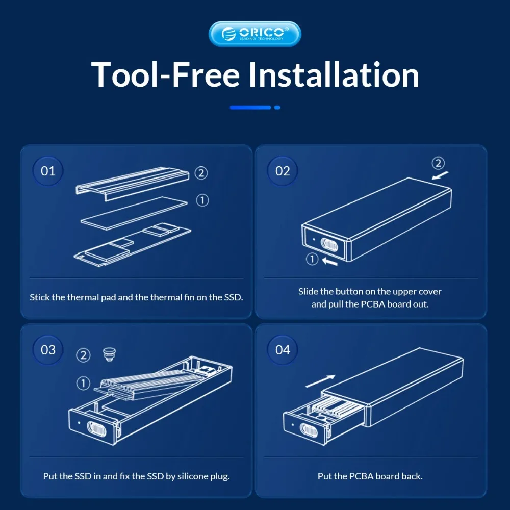 La carcasa ORICO 10Gbps M.2 SSD es compatible con M Key o M & B Key's 2230 2242 2260 2280 M.2 PCIe NVMe SSD. La carcasa SSD es compatible con Windows, Mac OS y Linux. Plug and play, no se requieren controladores ni software adicionales.