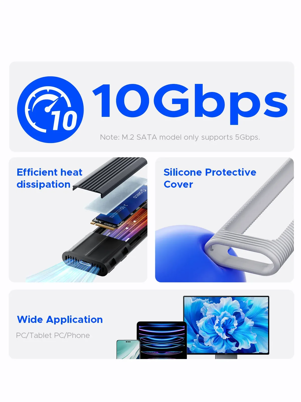 Caja SSD sin herramientas para una instalación rápida y fácil. Plug and play, no se requieren controladores. El diseño de la hebilla de la carcasa M.2 SSD puede garantizar una transferencia estable y rápida.
