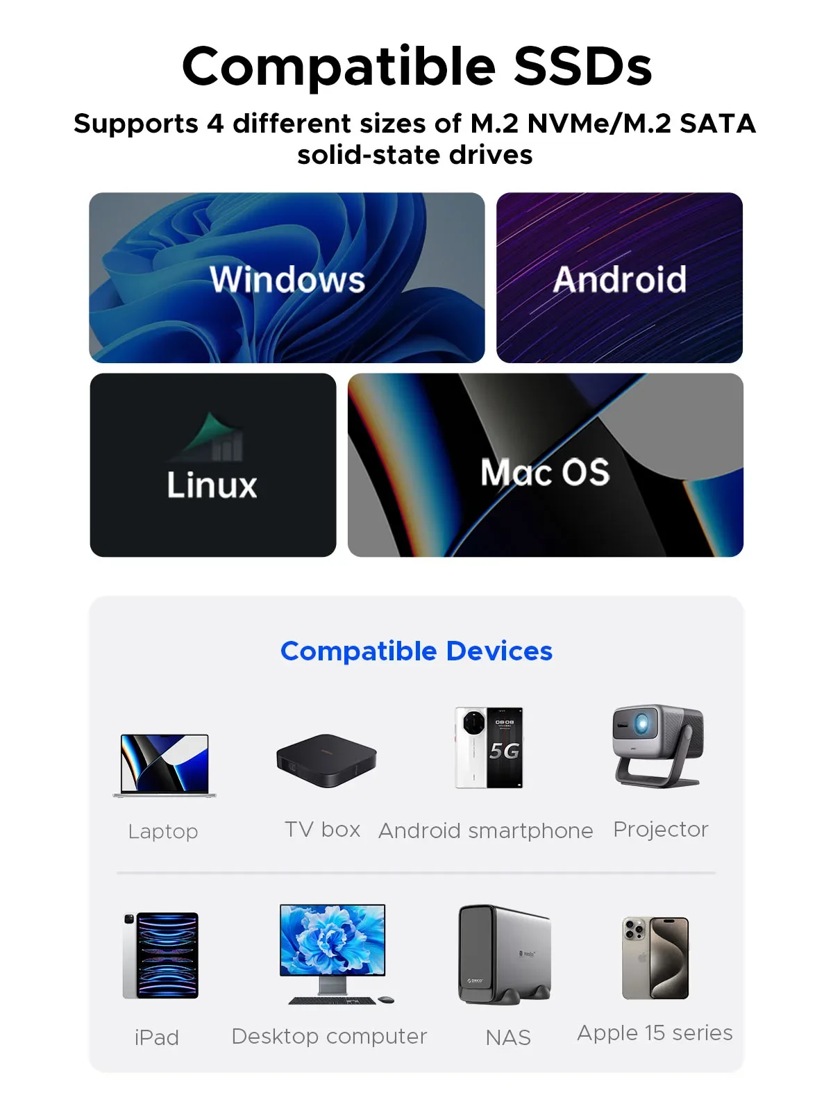 Con cortocircuito, sobrecorriente y protección múltiple para garantizar la seguridad de su SSD y datos valiosos, y es compatible con UASP/ Trim con alta velocidad de transferencia.