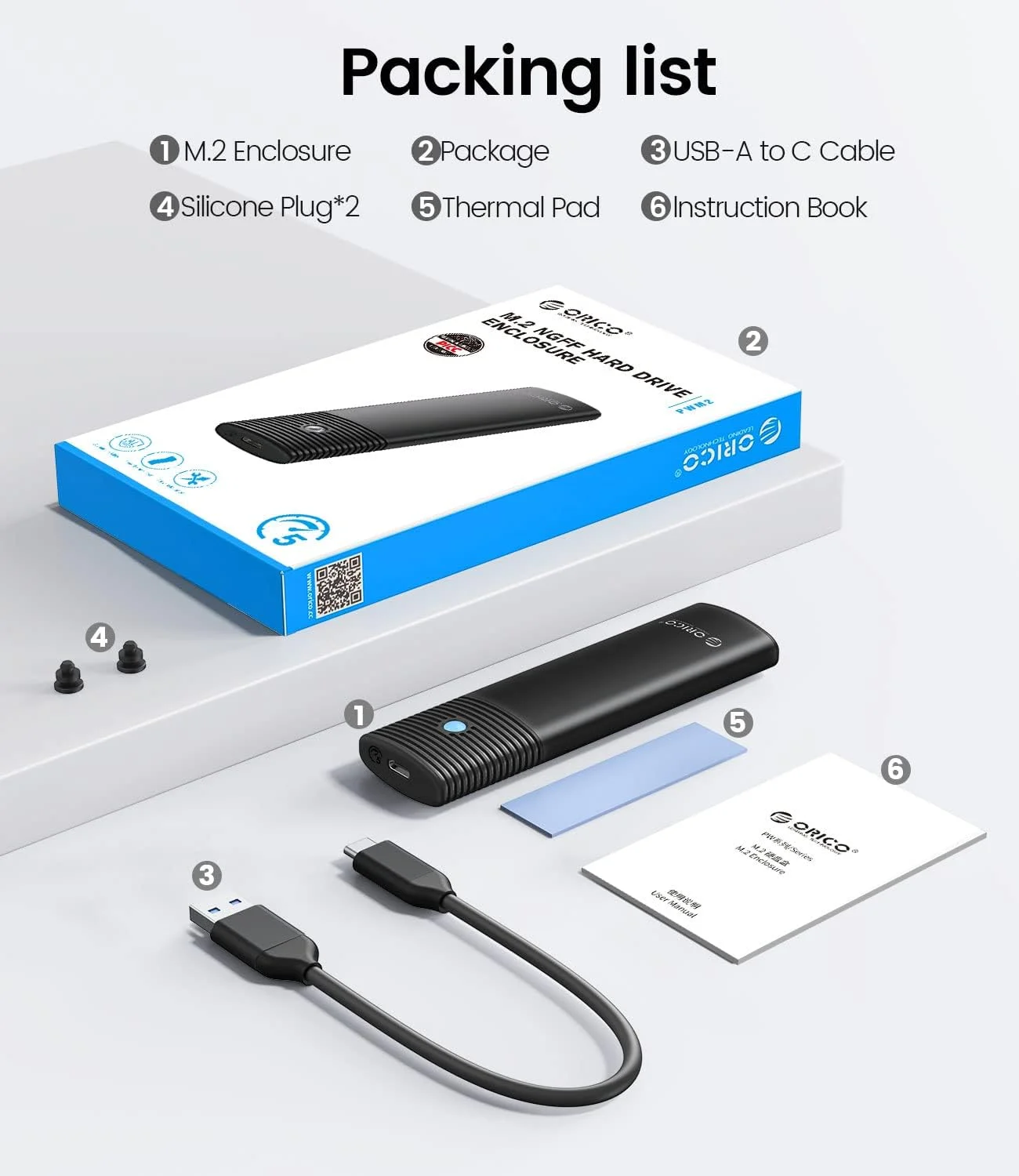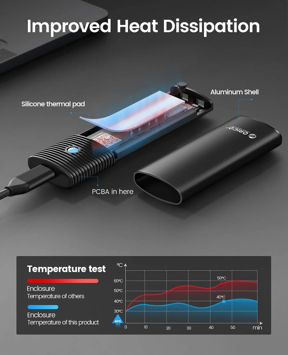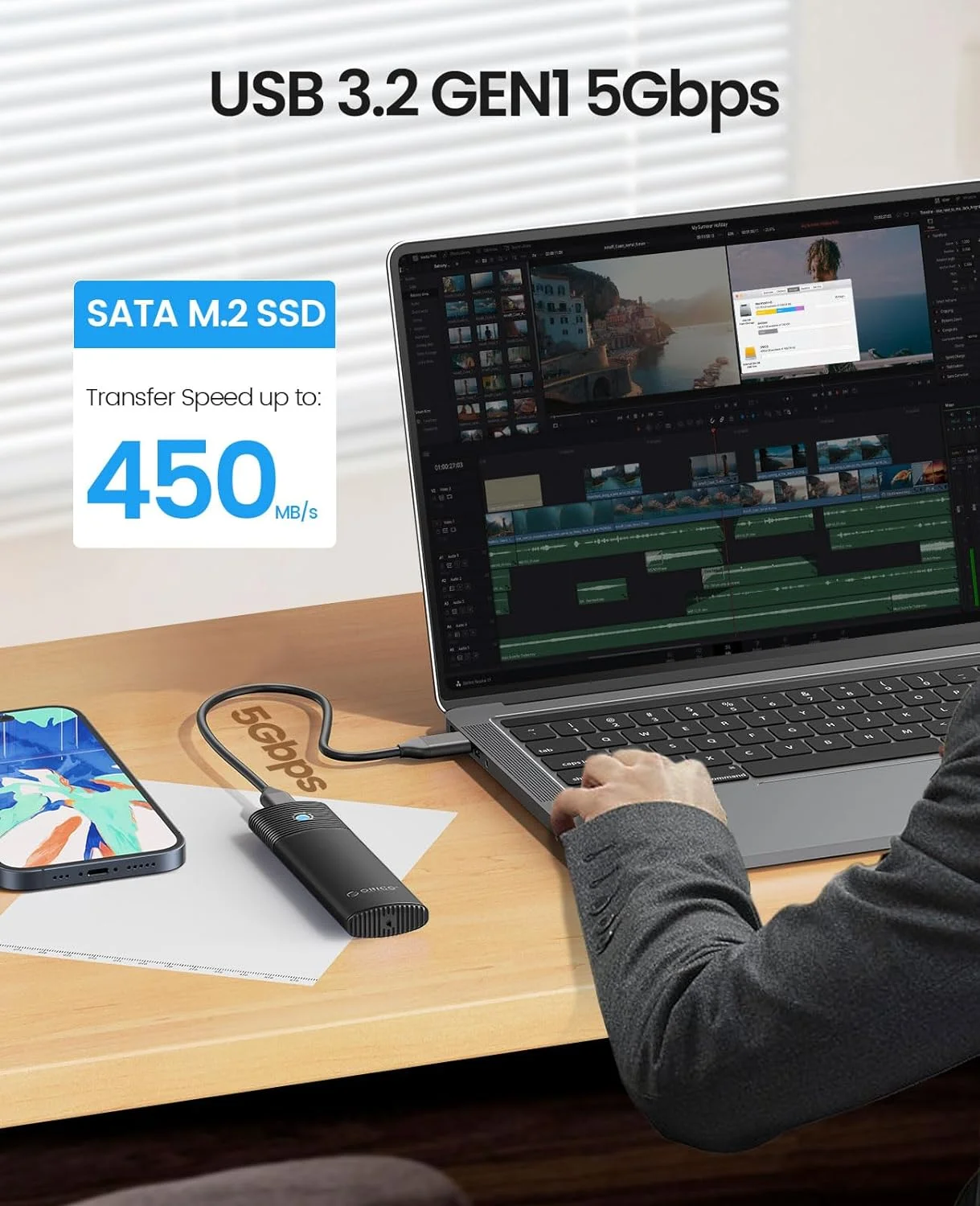 La carcasa externa ORICO M.2 NGFF SSD adopta el chip de control, con protocolo de aceleración UASP e interfaz de salida USB3.1 tipo C, alcanza hasta más de 440 MB/s de velocidad de escritura/lectura combinada con tu SSD M.2 SATA.