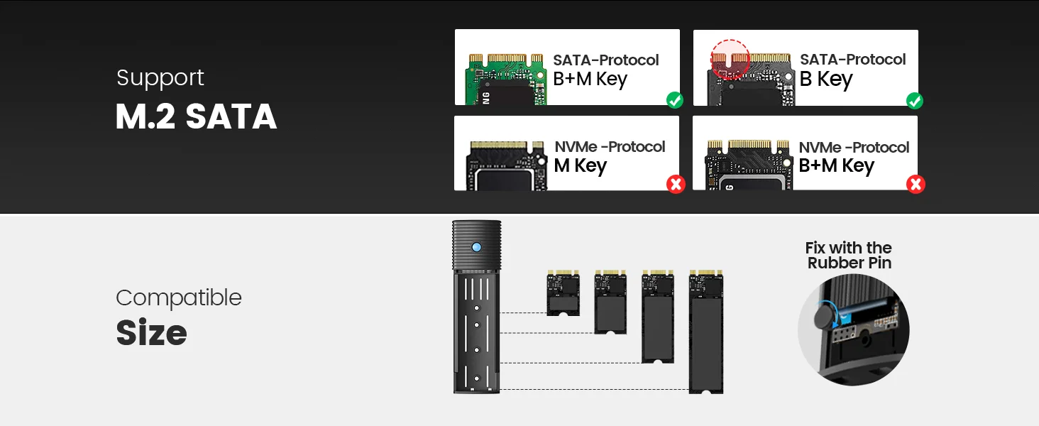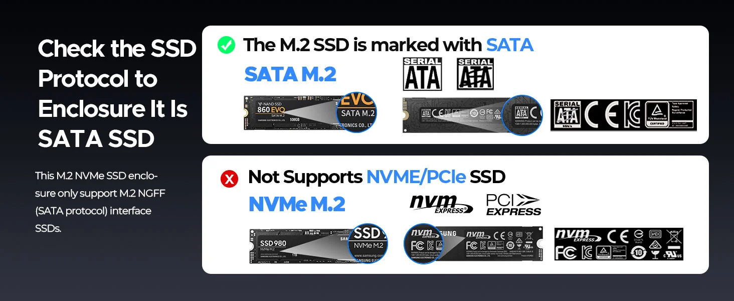 Compatible con la mayoría de SSD M.2 SATA basado en 2280/2260/2242/2230 B Key / B + M Key M.2 NGFF SSD de hasta 4TB como Samsung 860 EVO / 850 EVO M.2 SATA III SSD, WD Green M.2 2280, etc.