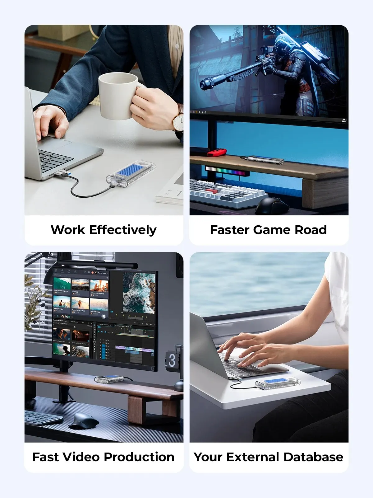 Con tecnología USB4, Esta carcasa SSD proporciona velocidades de transferencia de datos ultrarrápidas de hasta40Gbps.Haciendo transferencias de archivos y copias de seguridad rápidas y eficientes.