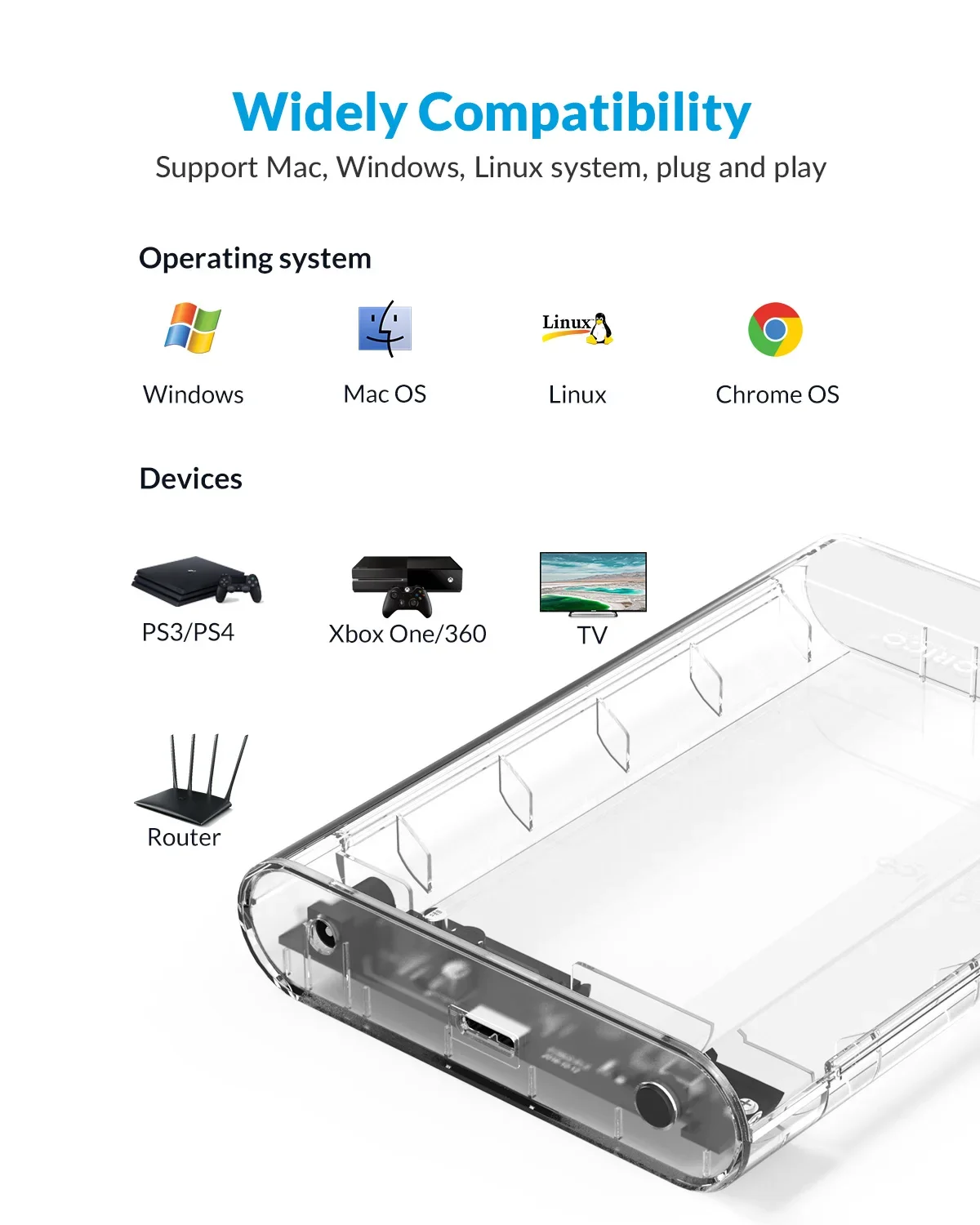 La carcasa de disco duro externo 3,5 USB puede admitir sistemas operativos Windows, Linux y Mac OS y también es un buen ayudante al conectar TV, computadoras portátiles, computadoras, PS4, XBOX One, etc. herramientas ideales para jugar.