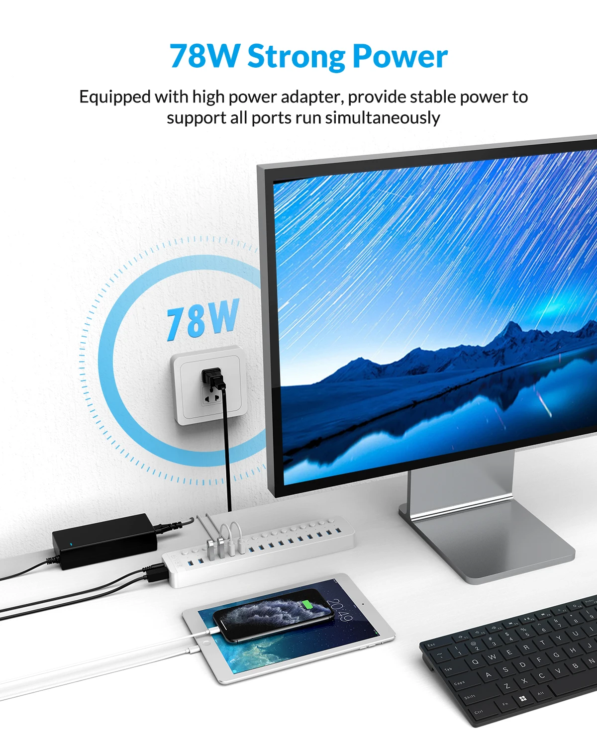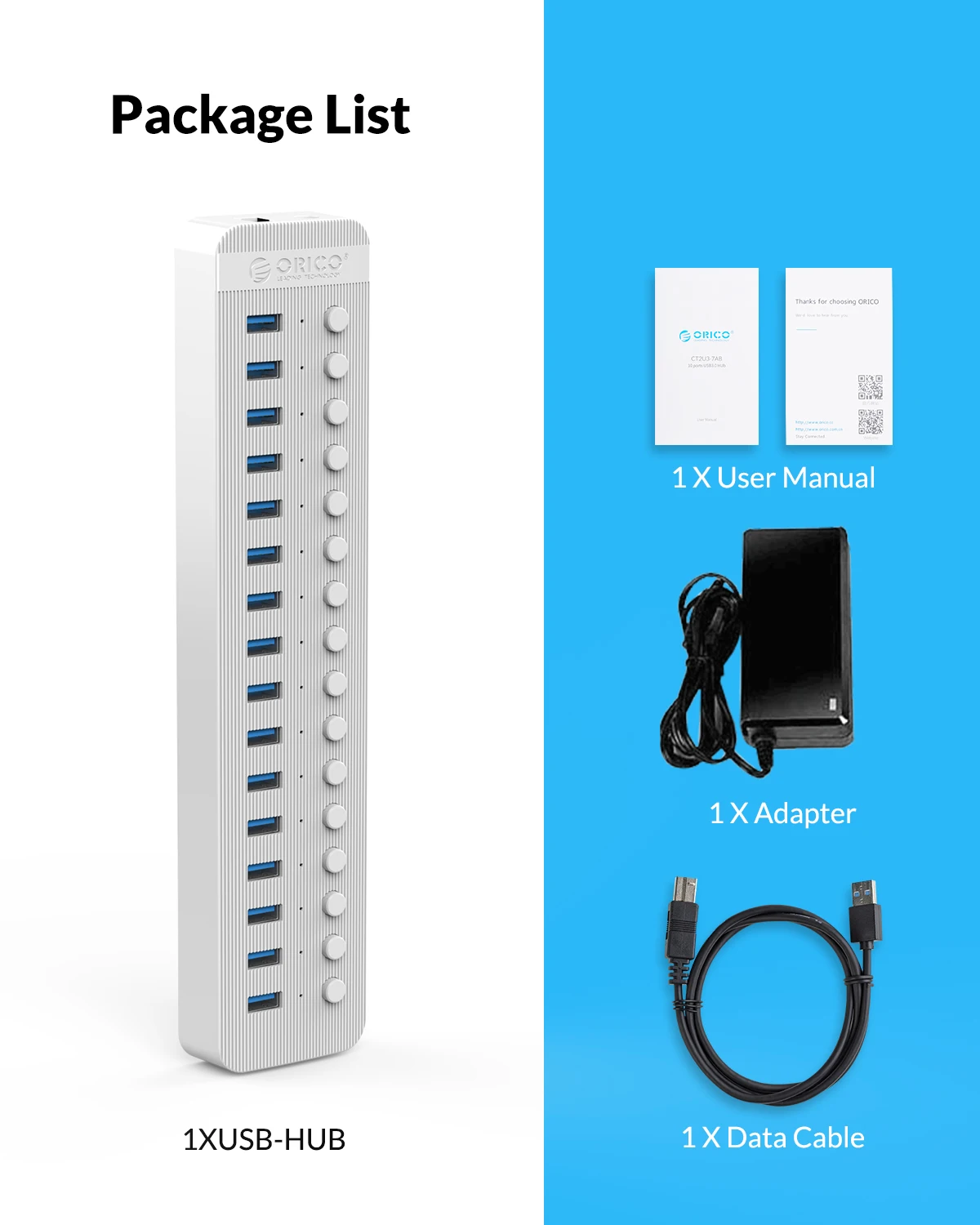 Este hub viene con un adaptador de 12V/6,5a, admite la conexión de 16 periféricos simultáneamente, Y garantiza un funcionamiento estable al conectarse con dispositivos de alto consumo de energía como discos duros externos (admite discos duros de gran capacidad de 4TB).