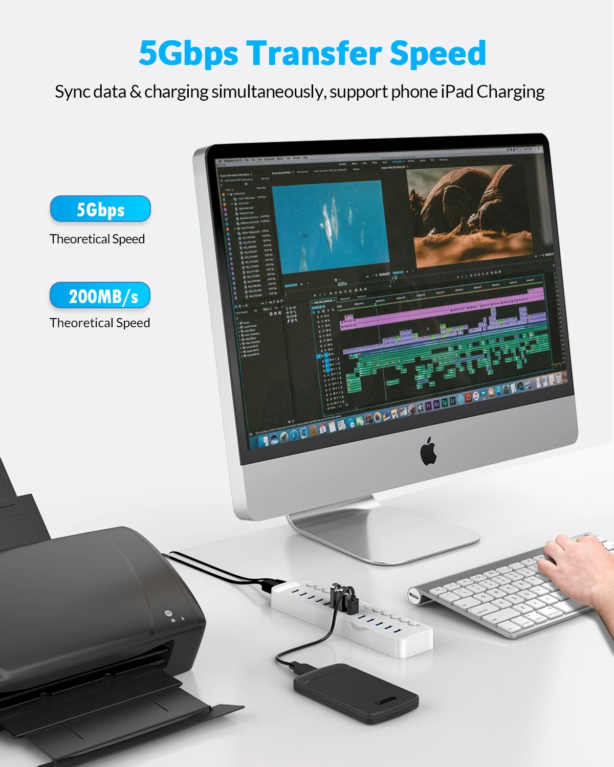 El concentrador divisor USB 3,0 admite una velocidad de transferencia de datos de hasta 5 Gbps para lograr una transferencia rápida entre dispositivos para que ahora pueda transferir películas HD en poco tiempo. Cada puerto USB de carga rápida del concentrador de carga USB alimentado puede entregar hasta 1,5 A máximo de corriente, ideal para su iPad/tableta y otros dispositivos USB.