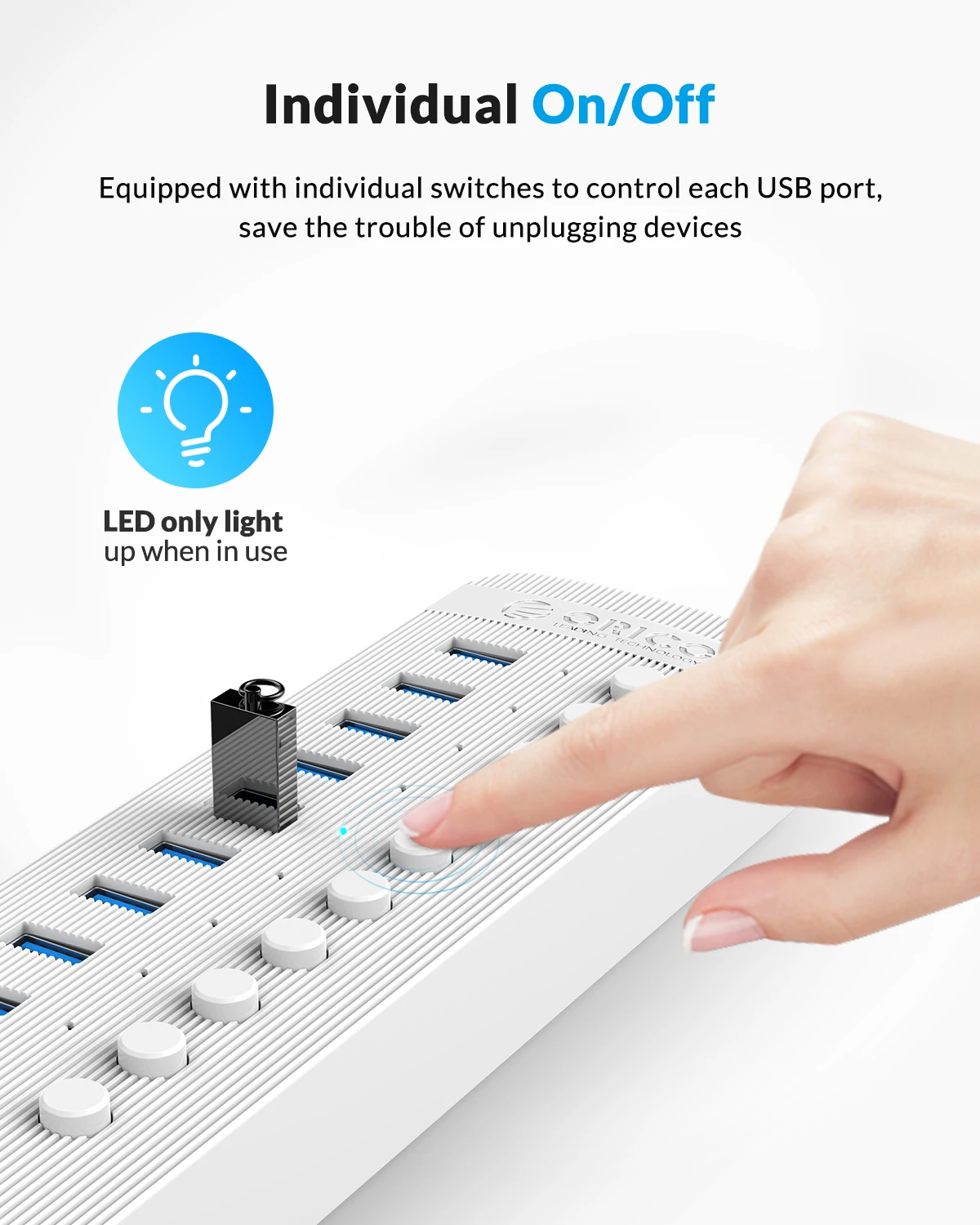Cada puerto del concentrador USB 3,0 tiene su propio interruptor de alimentación para que pueda apagar los dispositivos cuando no están en uso y cada puerto USB individual se controla de forma independiente y no se afectan entre sí. El indicador LED azul parpadea cuando se usa te facilita reconocer el encendido/apagado de los puertos USB.