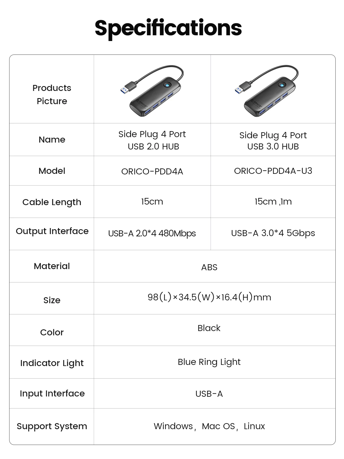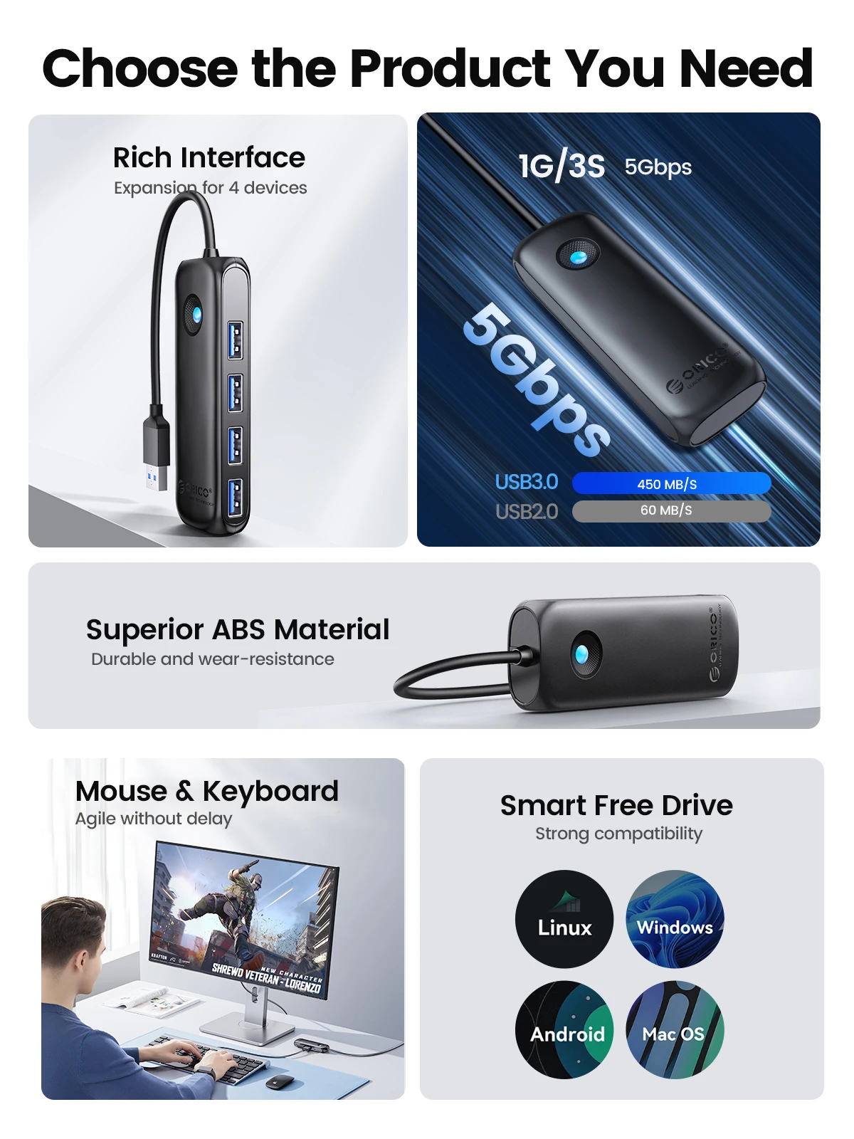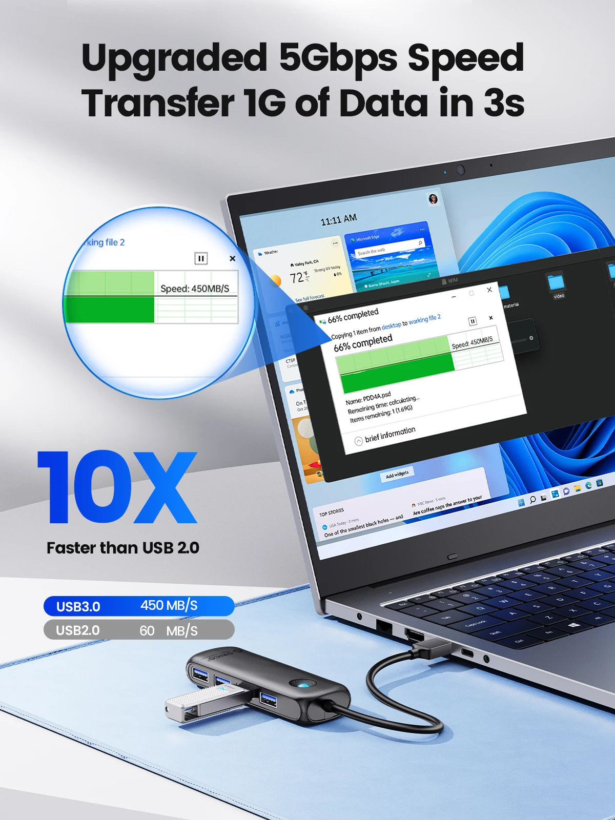 ORICO USB 3,0 Hub transfiere datos hasta 5Gbps, que es 10 veces más rápido que USB 2,0. Las películas HD se pueden transmitir en segundos. Compatible con USB 2,0, 1,1. Lectura simultánea de dos SSD de 1TB 2,5 "sin alimentación. Compatible con la función OTG, la función OTG no solo necesita soporte de Hub, sino también soporte de teléfono móvil.