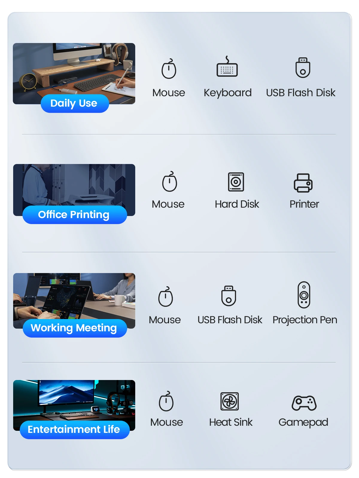 Admite 4 puertos que funcionan simultáneamente, resuelve el problema de algunas interfaces de portátiles y puede conectar teclado y ratón de disco USBfilash, HDD, etc.