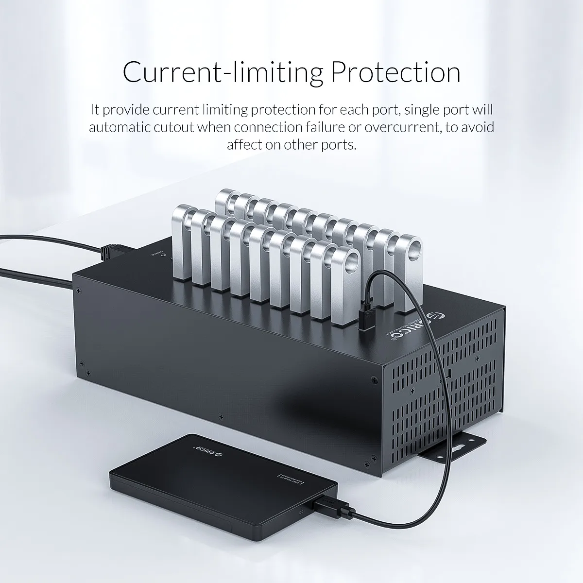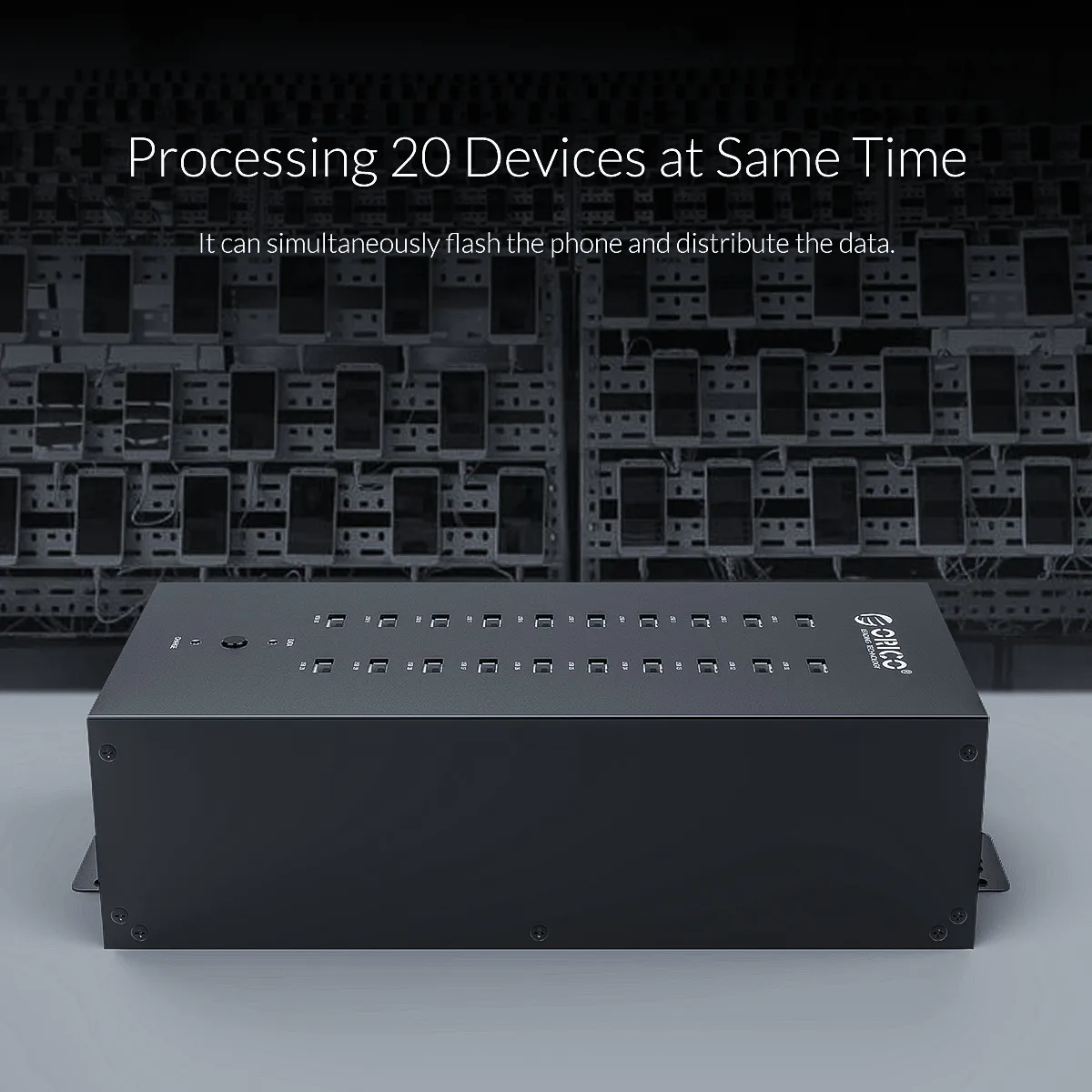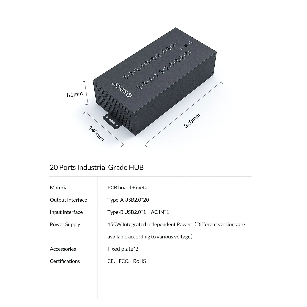 * Nombre del artículo: ORICO IH20P Industry 20 puertos USB2.0 HUB* Interfaz de salida: * 20 Tipo-A USB2.0 (5V 2.8A MAX)* Interfaz de entrada: 90-130V /200-250V* Tamaño: 238*138*76mm* Fuente de alimentación: adaptador de corriente de 150W* Certificado: CE / FCC / RoHSCaracterísticas:* Compatible con 20 puertos USB al mismo tiempo, plug and play.* Ampliamente compatible con teclado, ratón, u-disk, teléfono móvil, Banco de energía, impresora y otros dispositivos USB.* Diseño Multigrid, mejor para la disipación de calor, para que pueda soportar múltiples dispositivos usando al mismo tiempo.* Perchas extraíbles, asegúrese de que puede fijarlo a la pared o en el escritorio* Un interruptor de control principal, fácil de usar.* Fuente de alimentación integrada de 150W, que está certificada bajo el sistema 3c, y el HUB está certificado bajo CE , RoHS,* Cable de alta calidad, más estable para la transmisión de datos.* Múltiples protecciones, admite protección contra sobrecarga de voltaje, protege eficazmente sus dispositivos y el HUB USB.1*20 puertos USB2.0 HUB