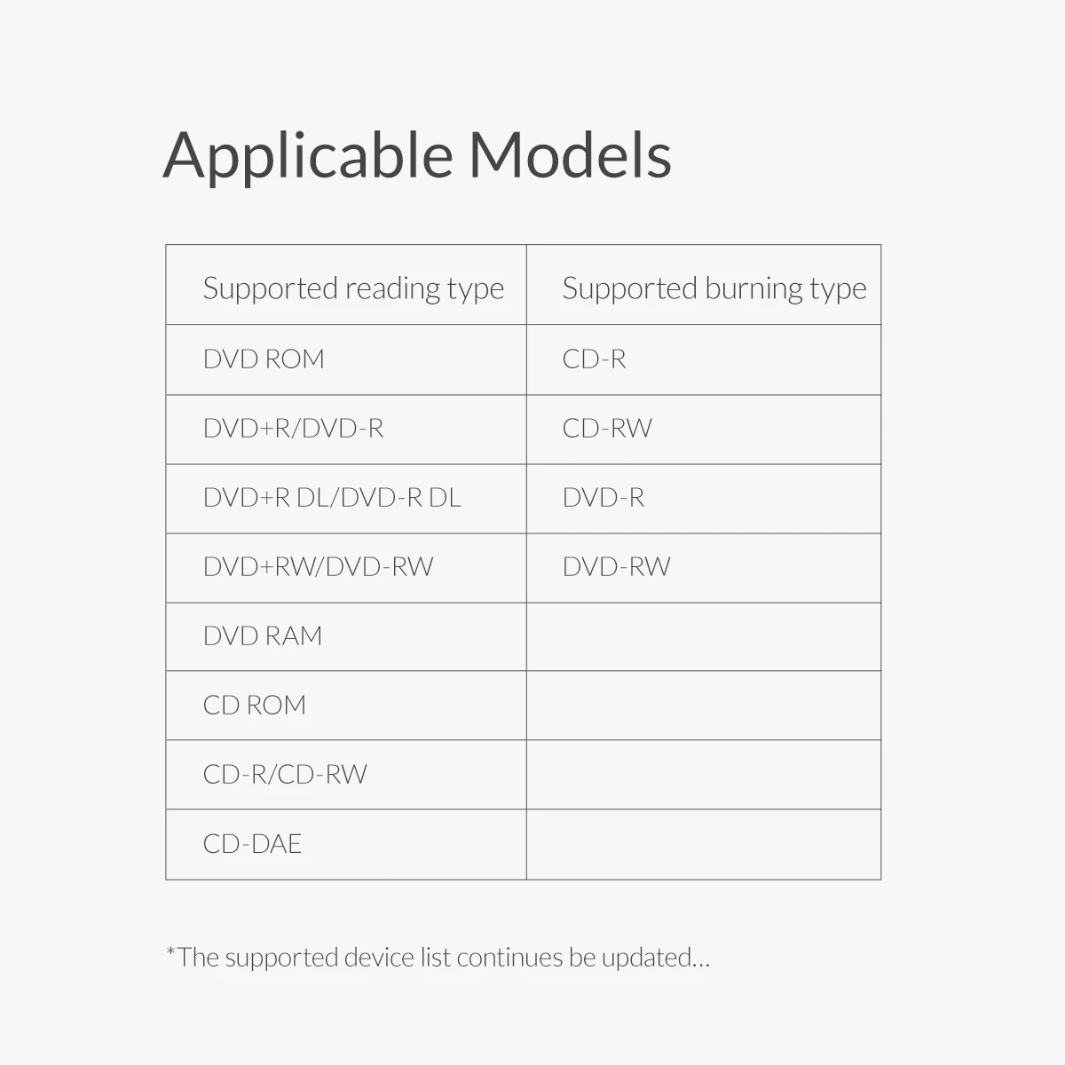 Tecnología de grabación y lectura inteligente única adoptada, unidad de CD/DVD ORICO compatible con el tipo de lectura (DVD + R, 1, 2, 2, 2, 3, 3, 4, DVD + R DL,DVD + R DL, 2, 3, 1, 1, 2, 3, 1, 2, 2, 1, 2, 1, 2, 2, 1, 2, 2, 2, 2, 2, 2, 2, velocidad de lectura de CD-ROW 24X, velocidad de lectura de CD-ROW 8X, velocidad de lectura de CD-ROW 24X, velocidad de lectura de DVD + RW, 1, 2, 1, 1, 2, 1, 2, 1, 1, 2, 1, 2, 1, 2, 1, 1, 1, 1, velocidad de grabación de 16X, velocidad de grabación de 8X, velocidad de grabación de 8X, velocidad de grabación de 8X, (admite lectura máxima de CD de capacidad de 8G), 2, 1, 2, 1, 2, 2