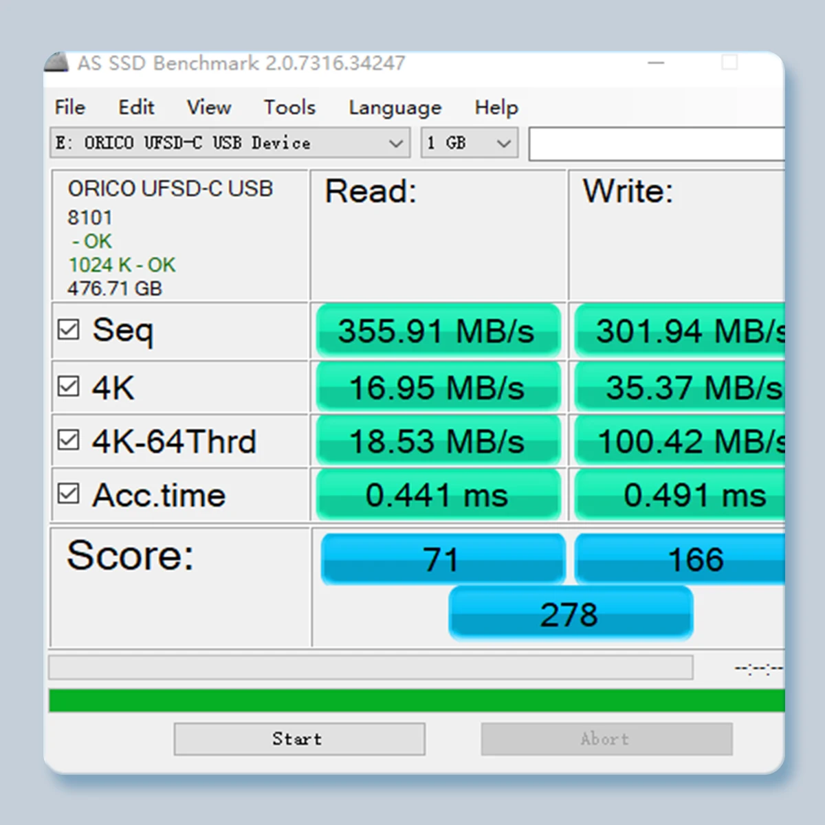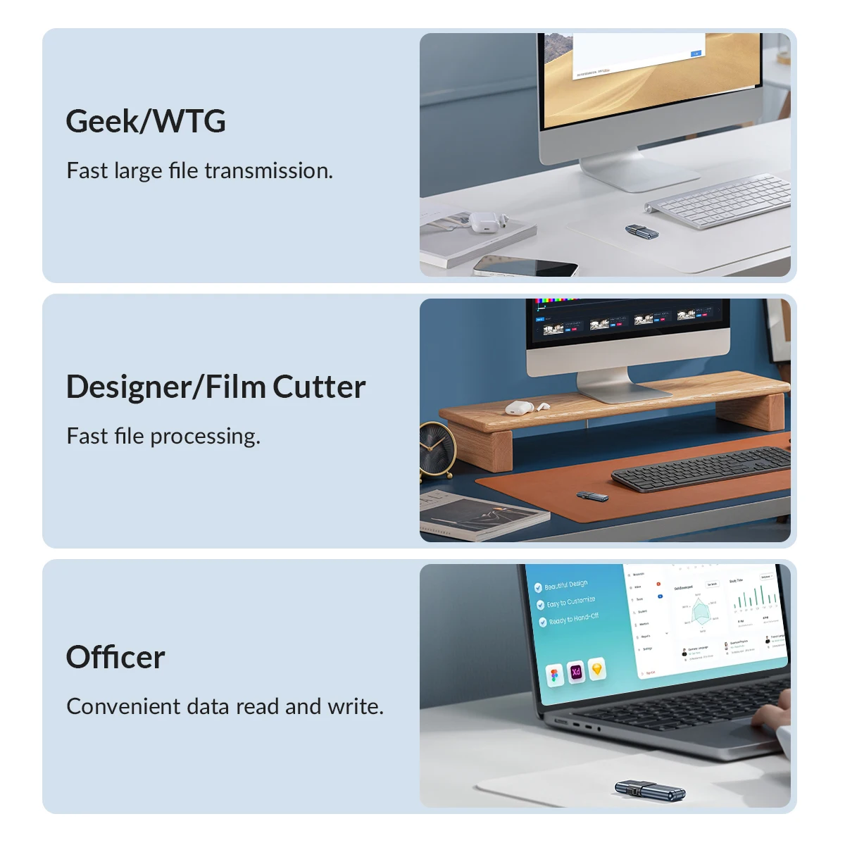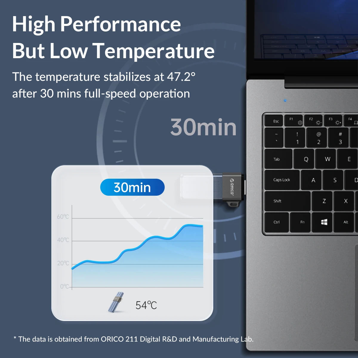 La unidad flash USSD USB3.2 Gen1 lee un archivo de 60GB en el entorno de prueba del laboratorio ORICO, la velocidad de transmisión es estable.3. Carcasa de metal elegante y duradera ---- Disipación rápida del calor