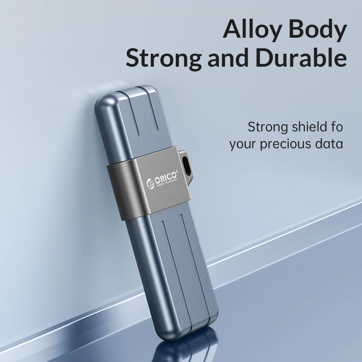La unidad flash ORICO USSD USB3.2 Gen1 cuenta con una carcasa de metal elegante pero resistente que protege la unidad de golpes inesperados.
