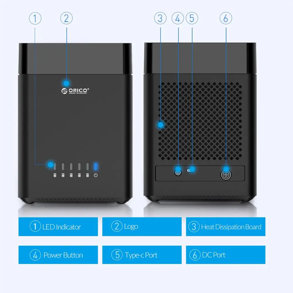 La carcasa ORICO 5 Bay HDD está equipada con un ventilador de doble rodamiento de bolas de 60mm, que, en cierta medida, puede enfriar y disipar el calor para el disco duro que se calienta debido al funcionamiento a alta velocidad.