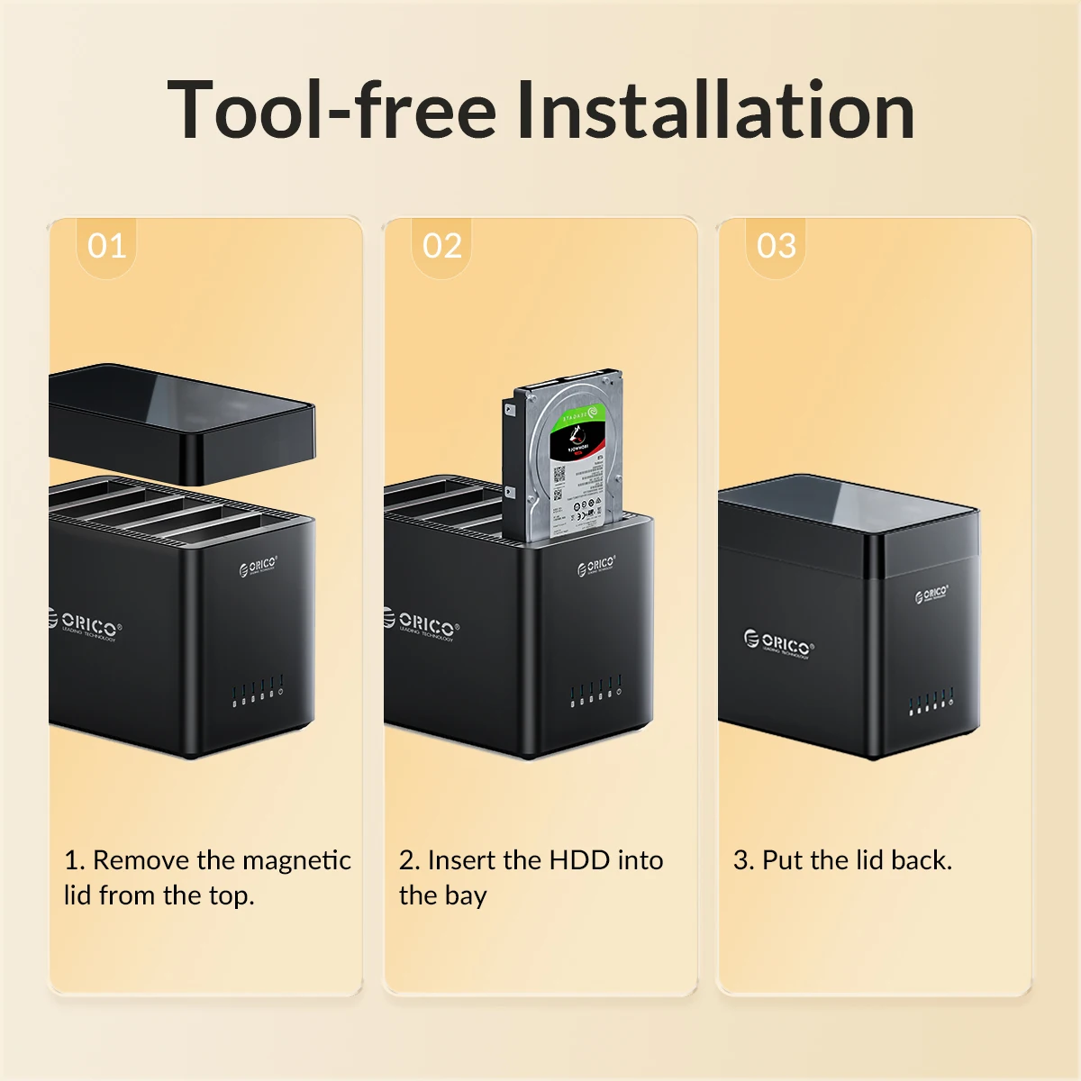 La carcasa de disco duro ORICO de 3,5 ''está diseñada con chips magnéticos en la cubierta, por lo que no se necesitan tornillos ni herramientas; Plug and play, y rápidamente