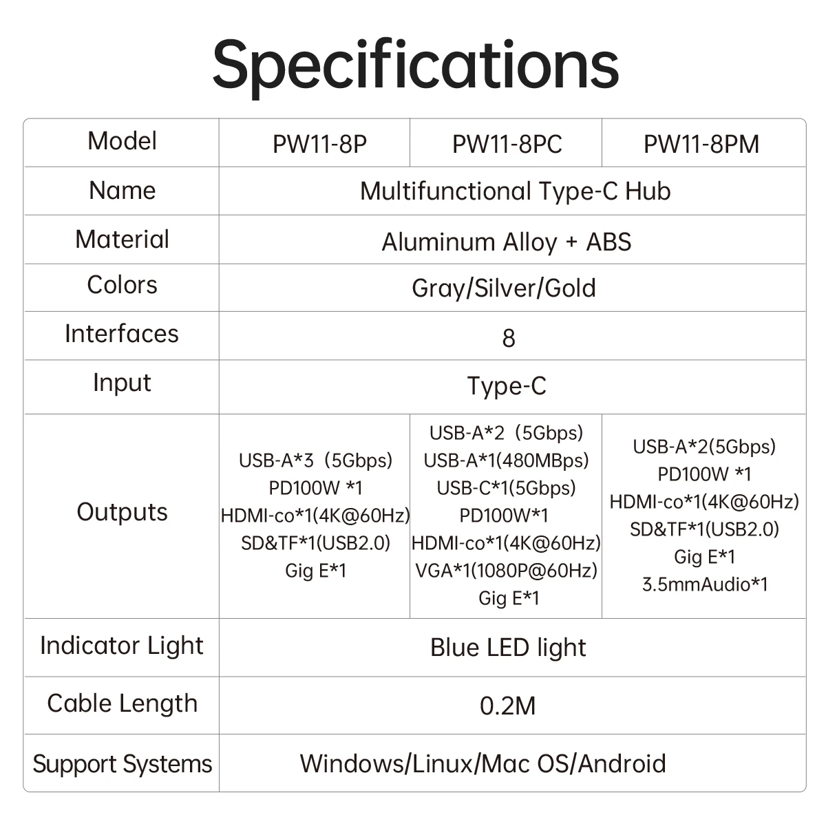 8.Gris 8 en 1 60 Hz VGA: USB-A*2(5Gbps) + USB-A*1(480MBps) + USB-C*1(5Gbps)+ PD100W*1 + compatible con HDMI*1(4K@60Hz) + VGA*1 (1080P@60Hz)+ RJ45(GigE)*1