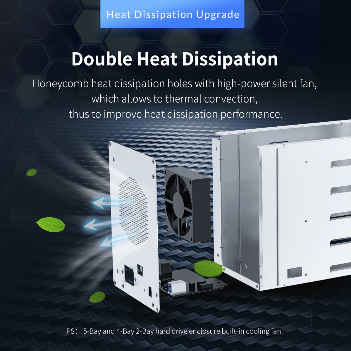 La carcasa 5 Bay Raid adopta una carcasa y un ventilador de aleación de aluminio de una pieza, que disipa bien el calor y puede alcanzar un grosor de 4mm, que es fuerte y confiable, Y el proceso de convección forzada ayuda a acelerar la circulación de aire y la ventilación de calor, enfriando eficazmente la unidad y el sistema general. Funcionamiento estable y larga vida útil.