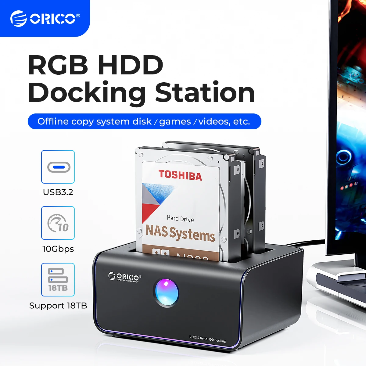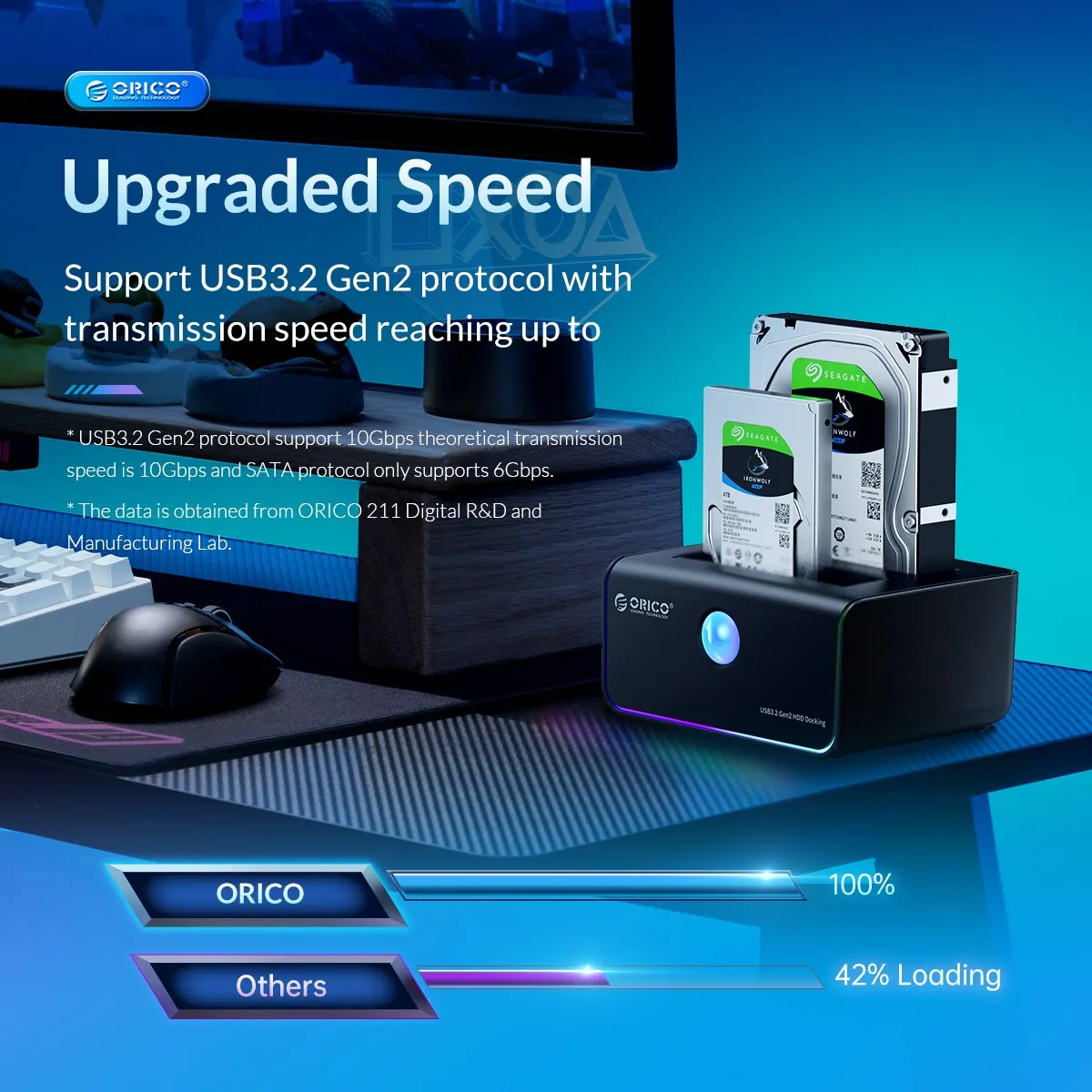Comprar ORICO-estación de acoplamiento de disco duro para entusiastas del juego, carcasa de clon sin conexión, RGB Light 2-bay tipo C, 10gbps